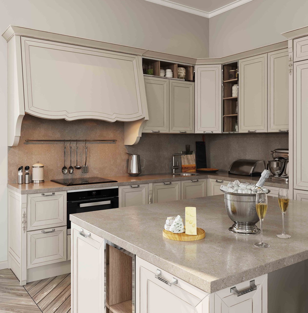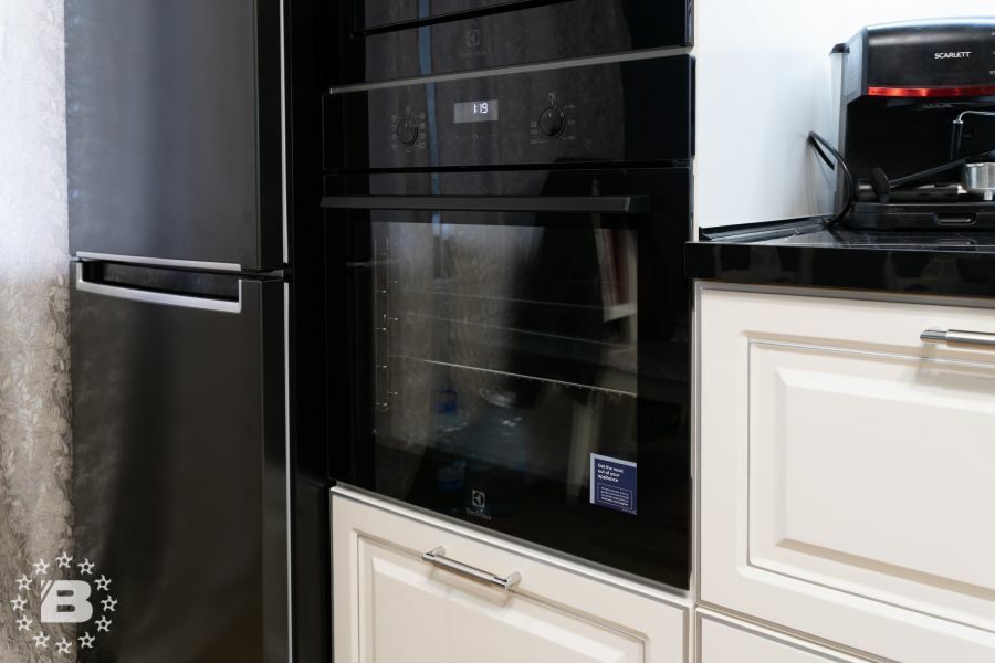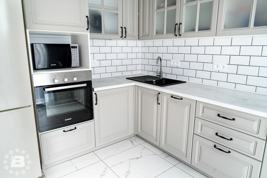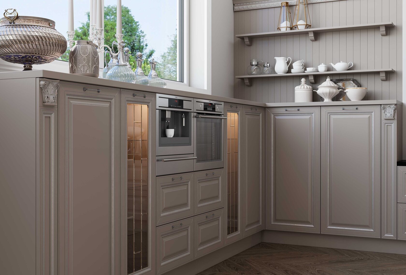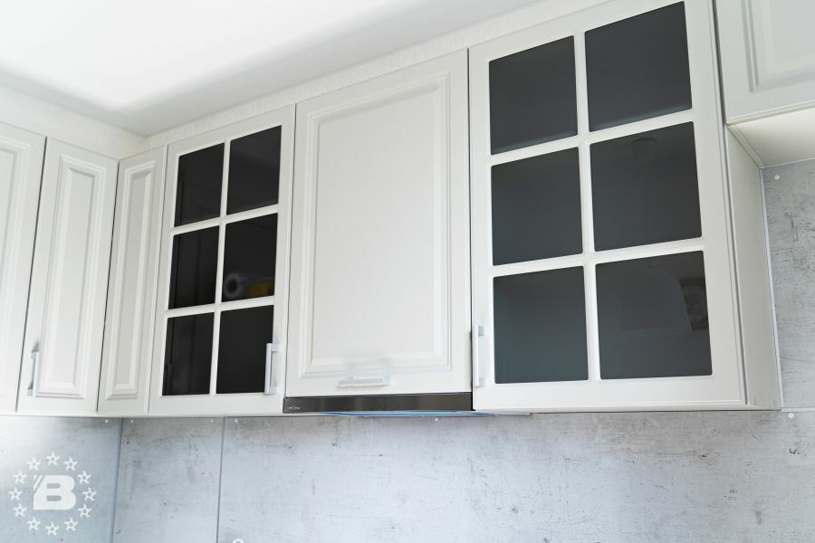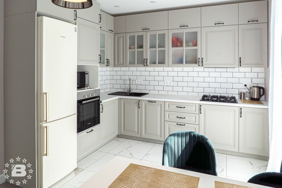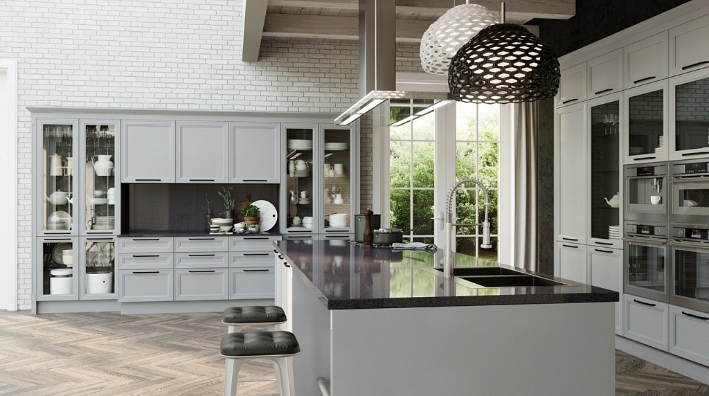 Кухня с элементами неоклассики, изящная и практичная, современная и функциональная. Кухня выполнена в спокойном цвете «Силк Циркон». Ряд фасадов украшен стеклянными вставками и фрезеровкой «Премьера». Черные матовые ручки создают стильный акцент в сочетании с кварцевой мойкой и встроенной техникой такого же цвета.