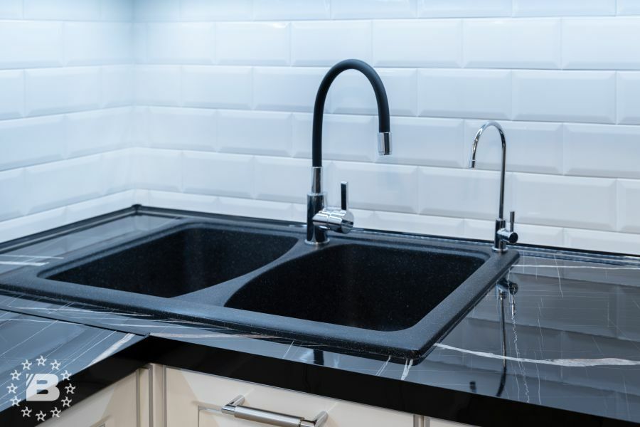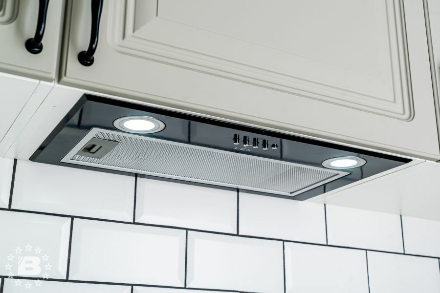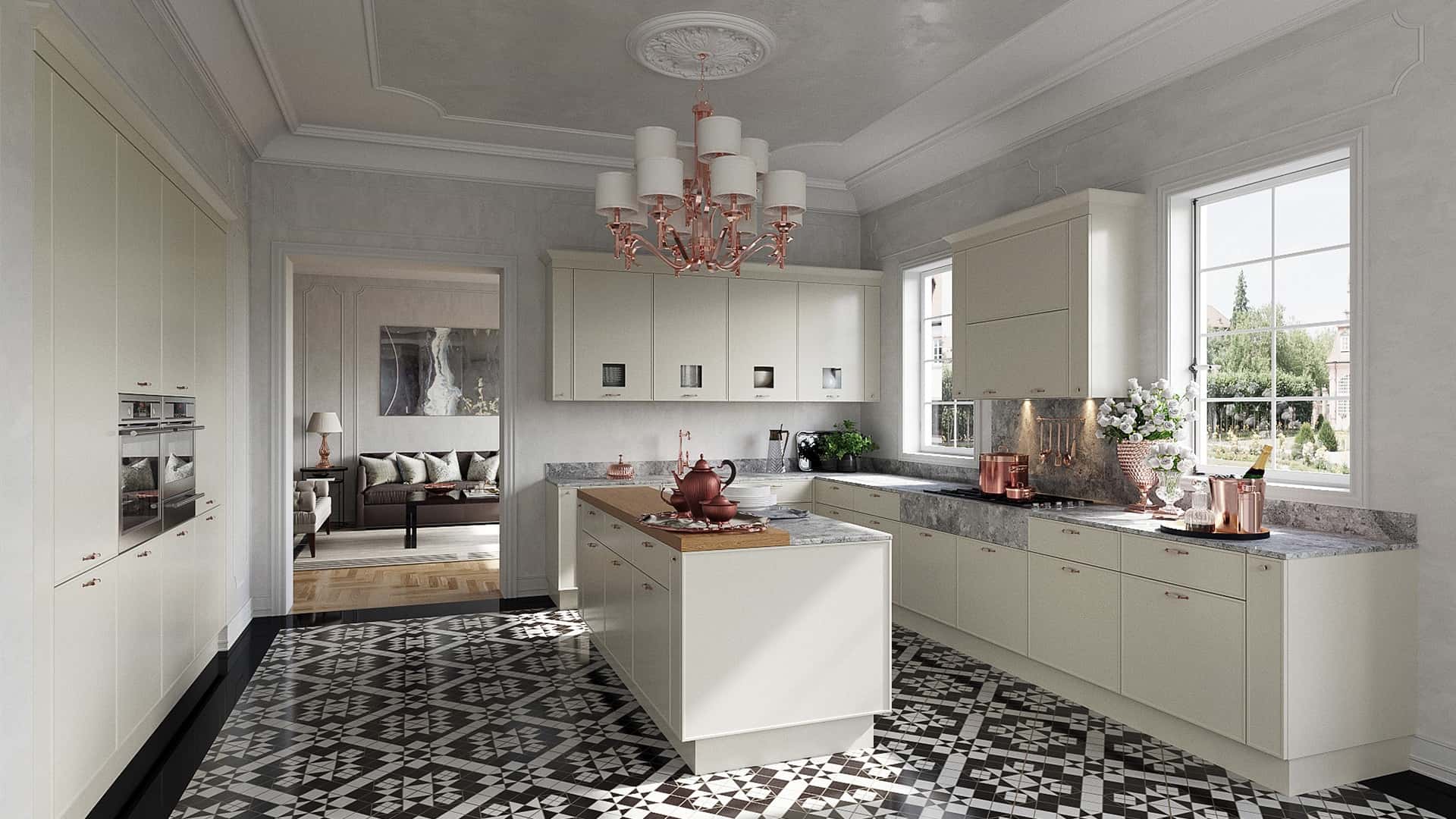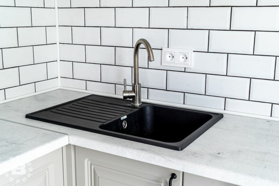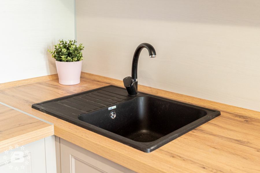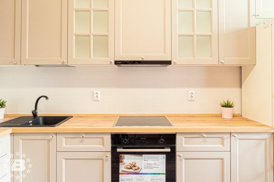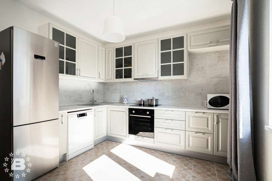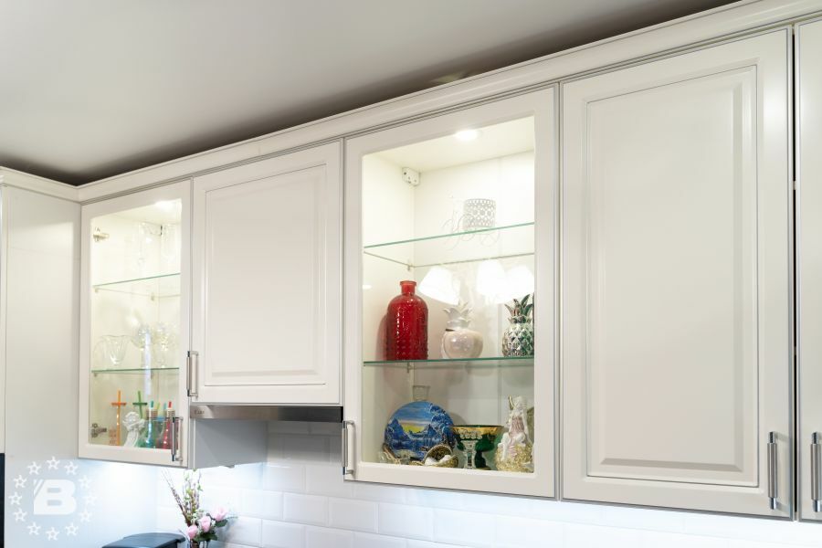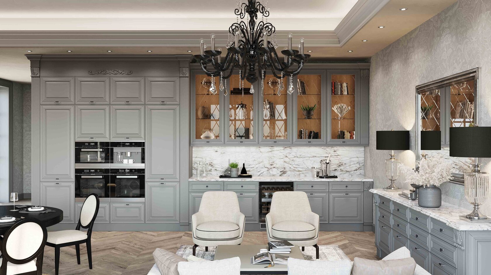 Кухня с элементами неоклассики, изящная и практичная, современная и функциональная. Кухня выполнена в спокойном цвете «Силк Циркон». Ряд фасадов украшен стеклянными вставками и фрезеровкой «Премьера». Черные матовые ручки создают стильный акцент в сочетании с кварцевой мойкой и встроенной техникой такого же цвета.