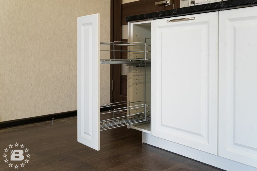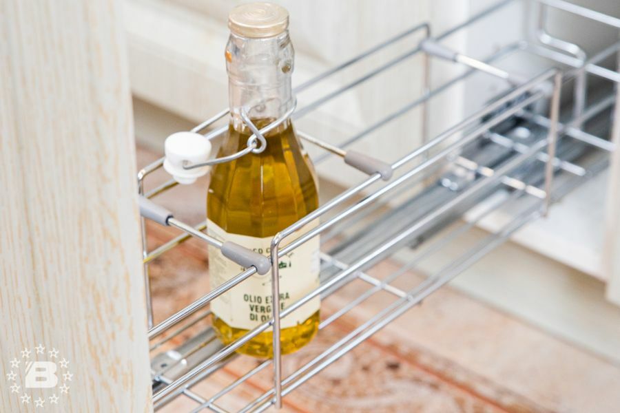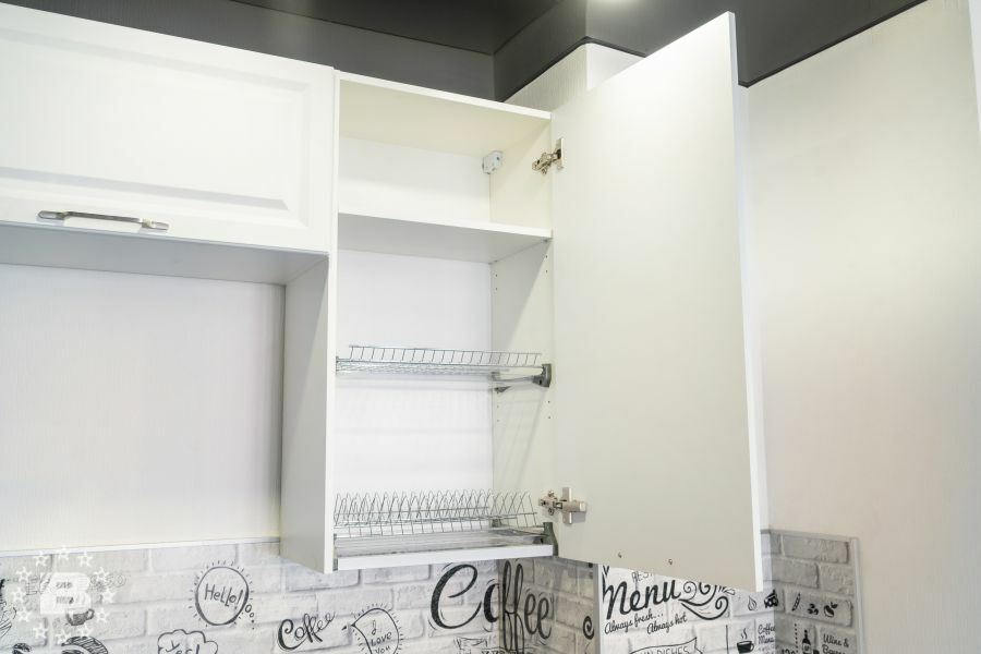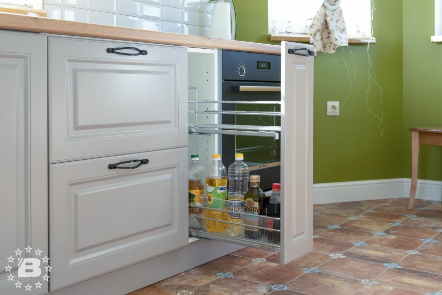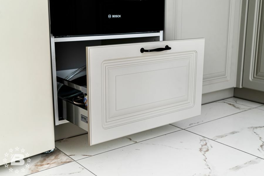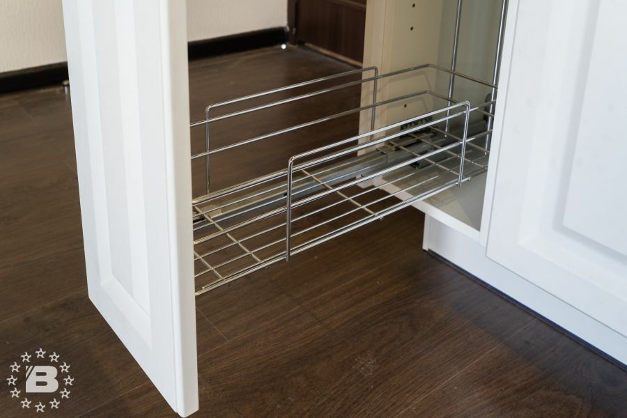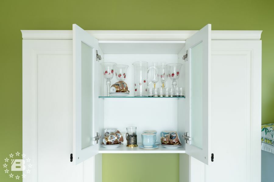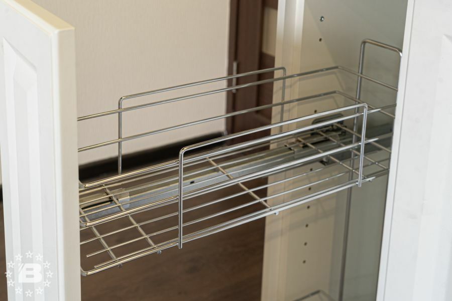 Кухня в стиле прованс подойдет и для квартиры и для загородного дома. Кухонный гарнитур и шкаф с жемчужно-белыми фасадами украсят кухню-гостиную. В нижних модулях встроена выкатная сушка для посуды и бутылочница.