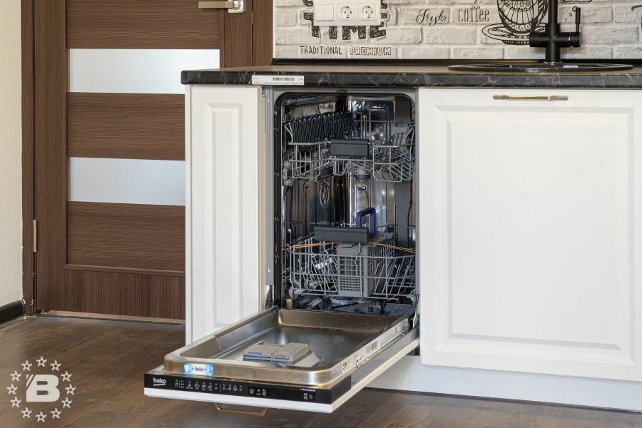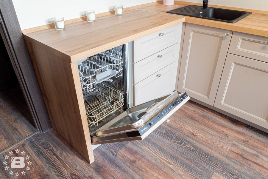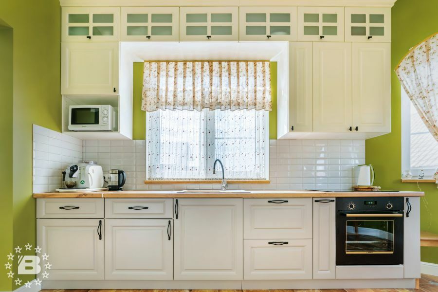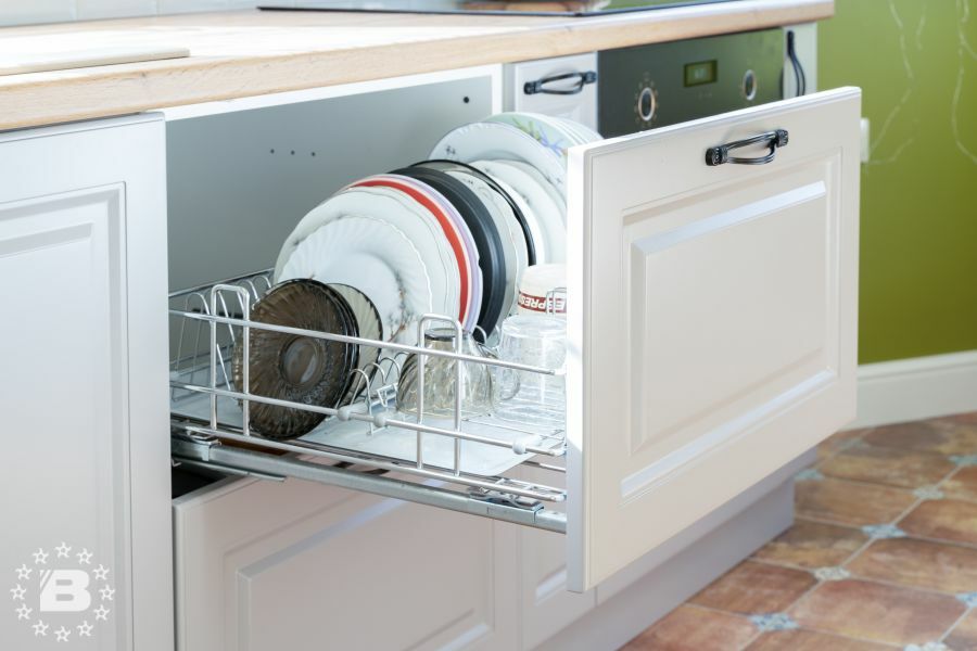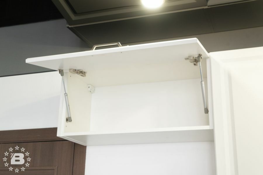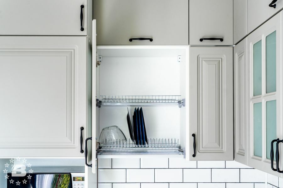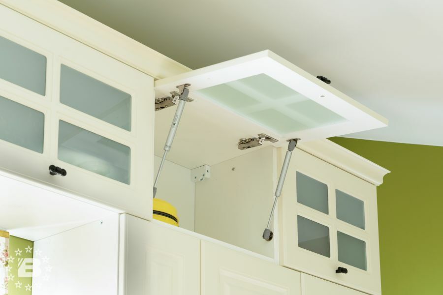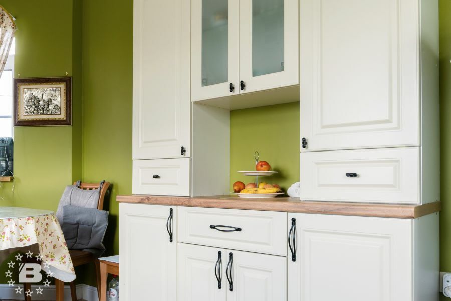 Кухня в стиле прованс подойдет и для квартиры и для загородного дома. Кухонный гарнитур и шкаф с жемчужно-белыми фасадами украсят кухню-гостиную. В нижних модулях встроена выкатная сушка для посуды и бутылочница.