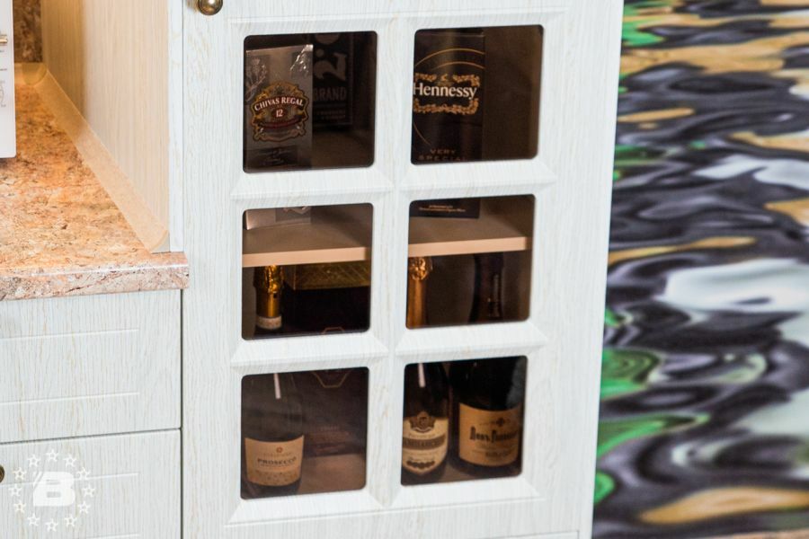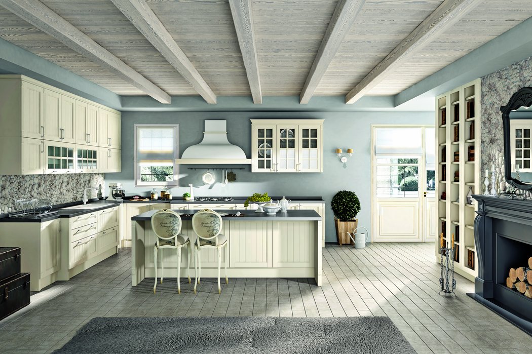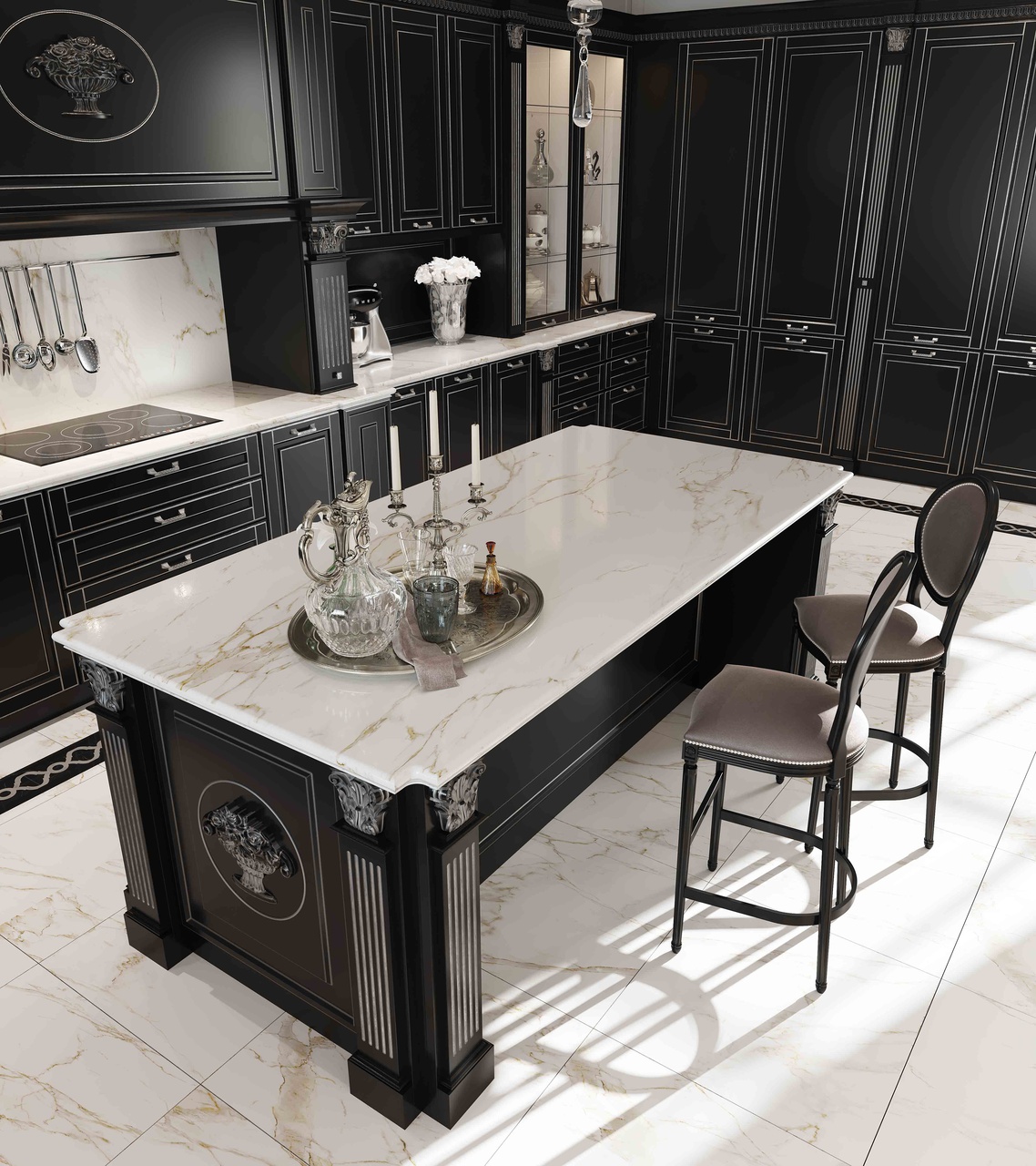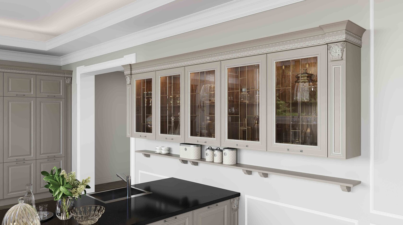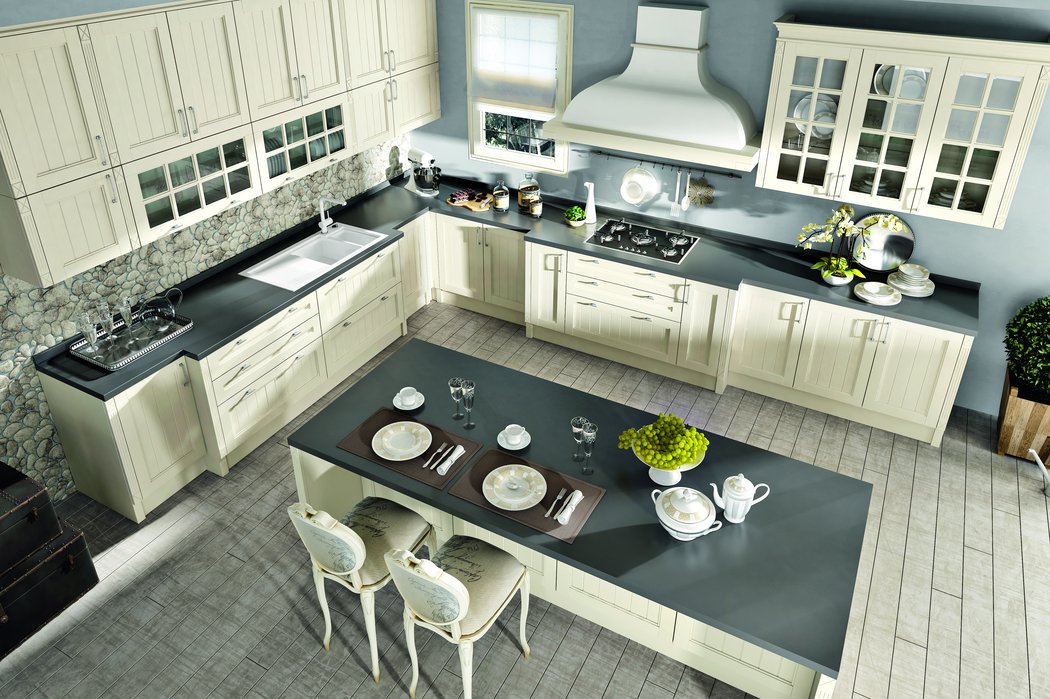 Претерпели изменения и витражи данной кухни. Гравировка стала более элегантной и легкой. А вновь разработанные карнизы с подкарнизником подчеркивают утонченного красоту итальянского дизайна. Добавив декор на подкарнизник, можно выделить часть кухонной конструкции. Обратите внимание, что корпуса за витринами выполнены из контрастного древесного декора.