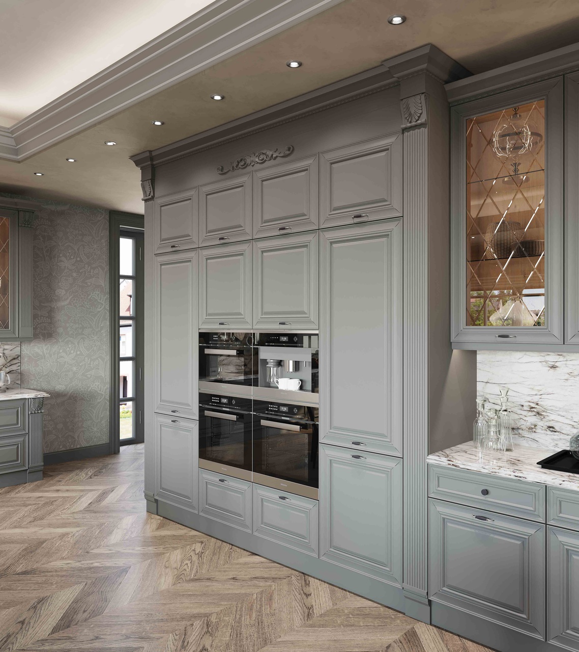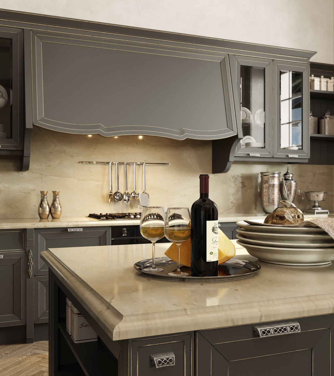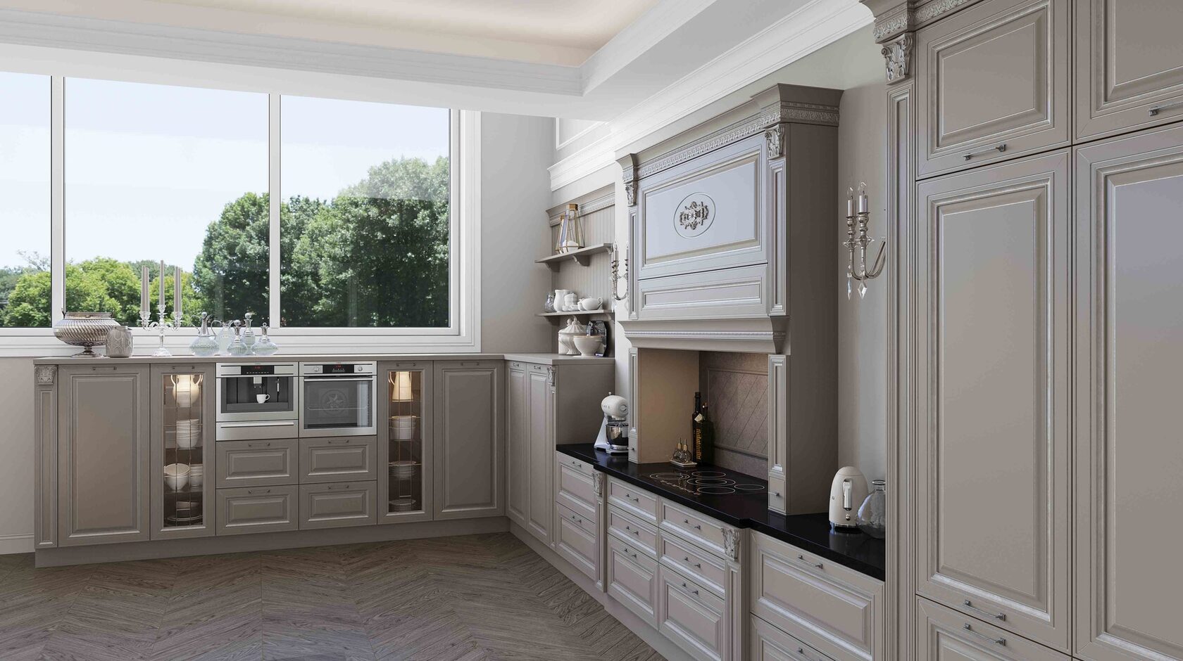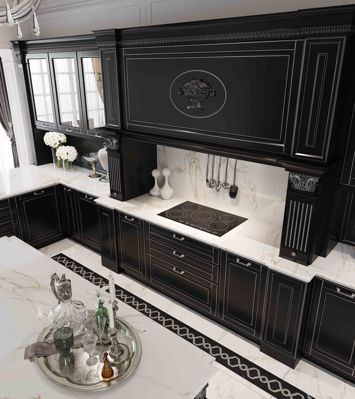 Претерпели изменения и витражи данной кухни. Гравировка стала более элегантной и легкой. А вновь разработанные карнизы с подкарнизником подчеркивают утонченного красоту итальянского дизайна. Добавив декор на подкарнизник, можно выделить часть кухонной конструкции. Обратите внимание, что корпуса за витринами выполнены из контрастного древесного декора.