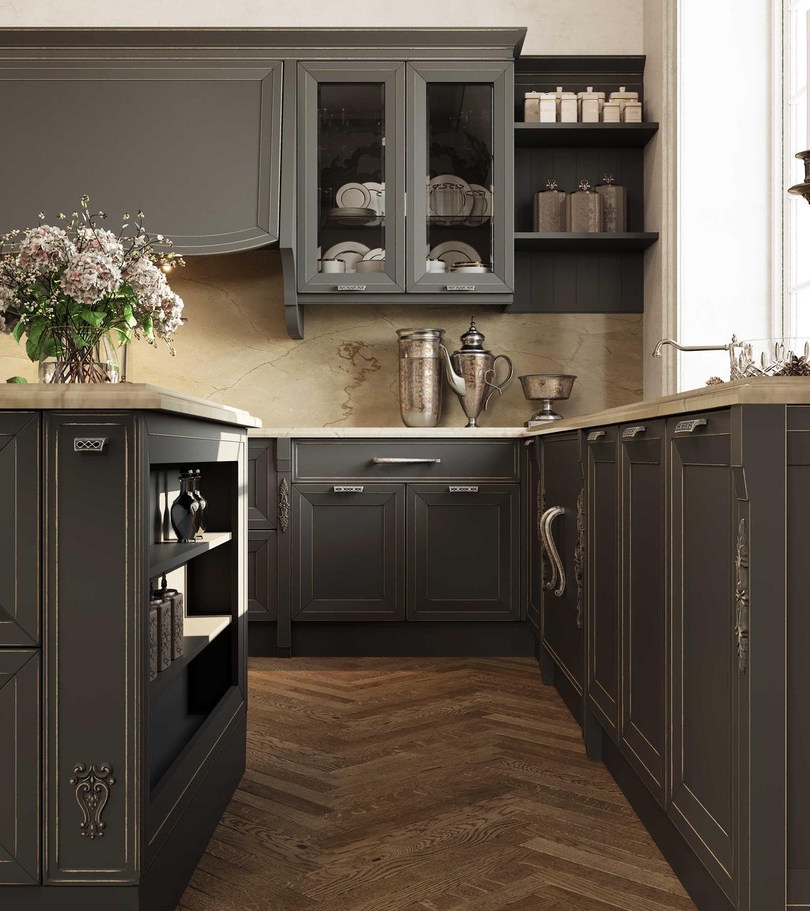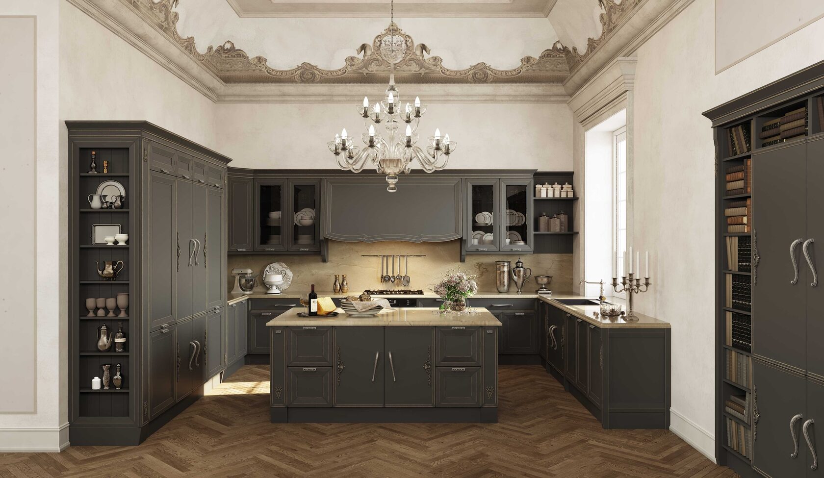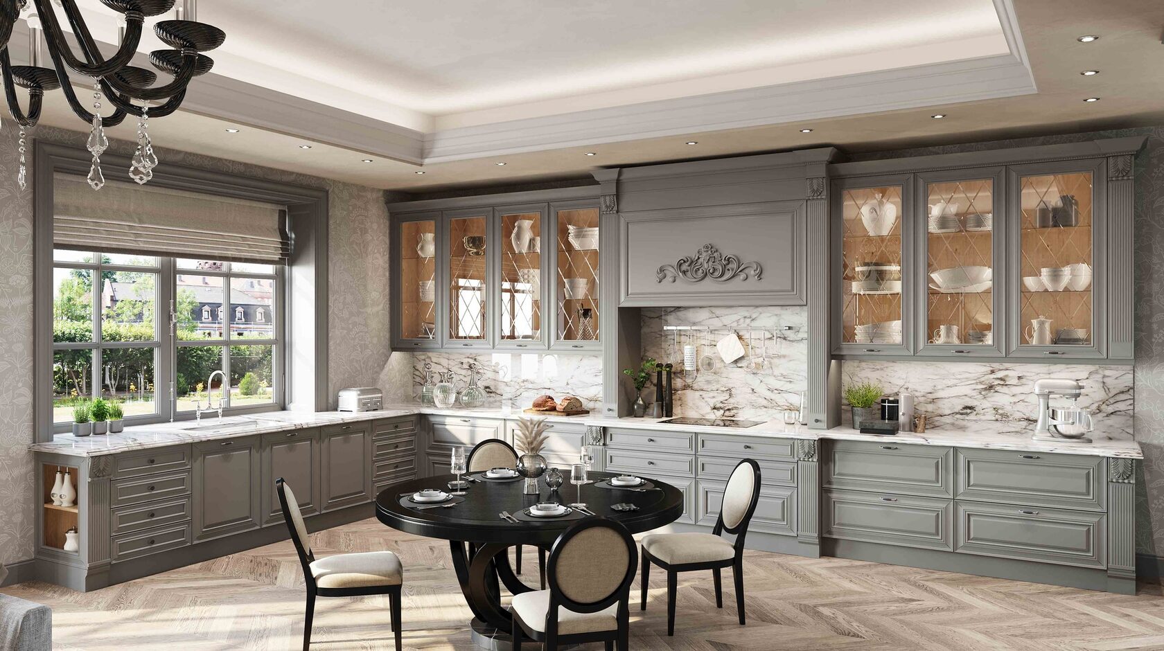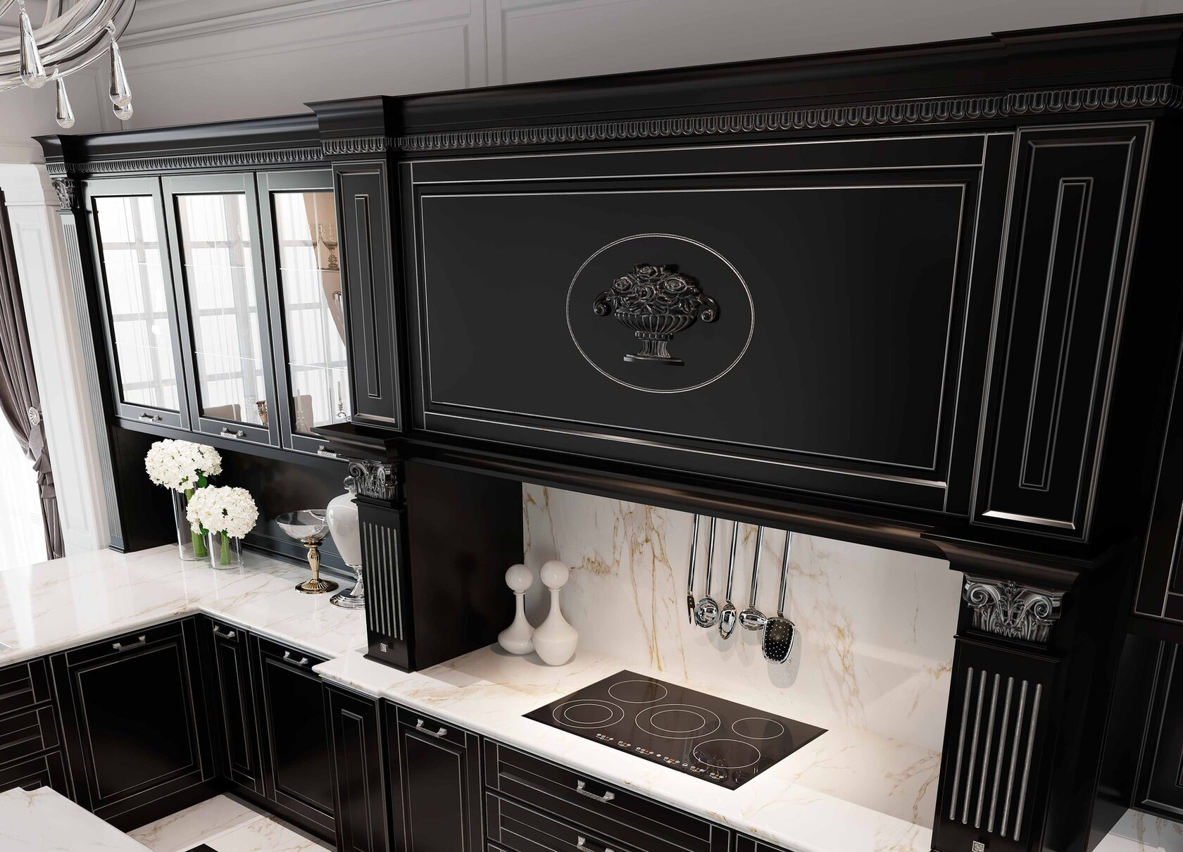 Претерпели изменения и витражи данной кухни. Гравировка стала более элегантной и легкой. А вновь разработанные карнизы с подкарнизником подчеркивают утонченного красоту итальянского дизайна. Добавив декор на подкарнизник, можно выделить часть кухонной конструкции. Обратите внимание, что корпуса за витринами выполнены из контрастного древесного декора.