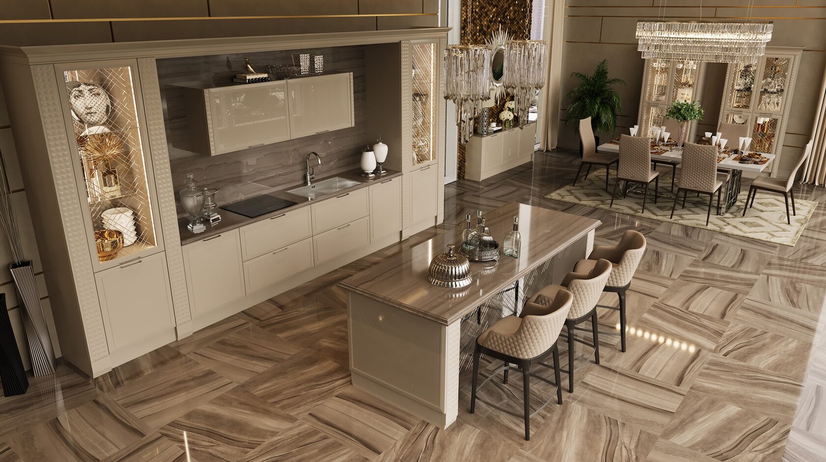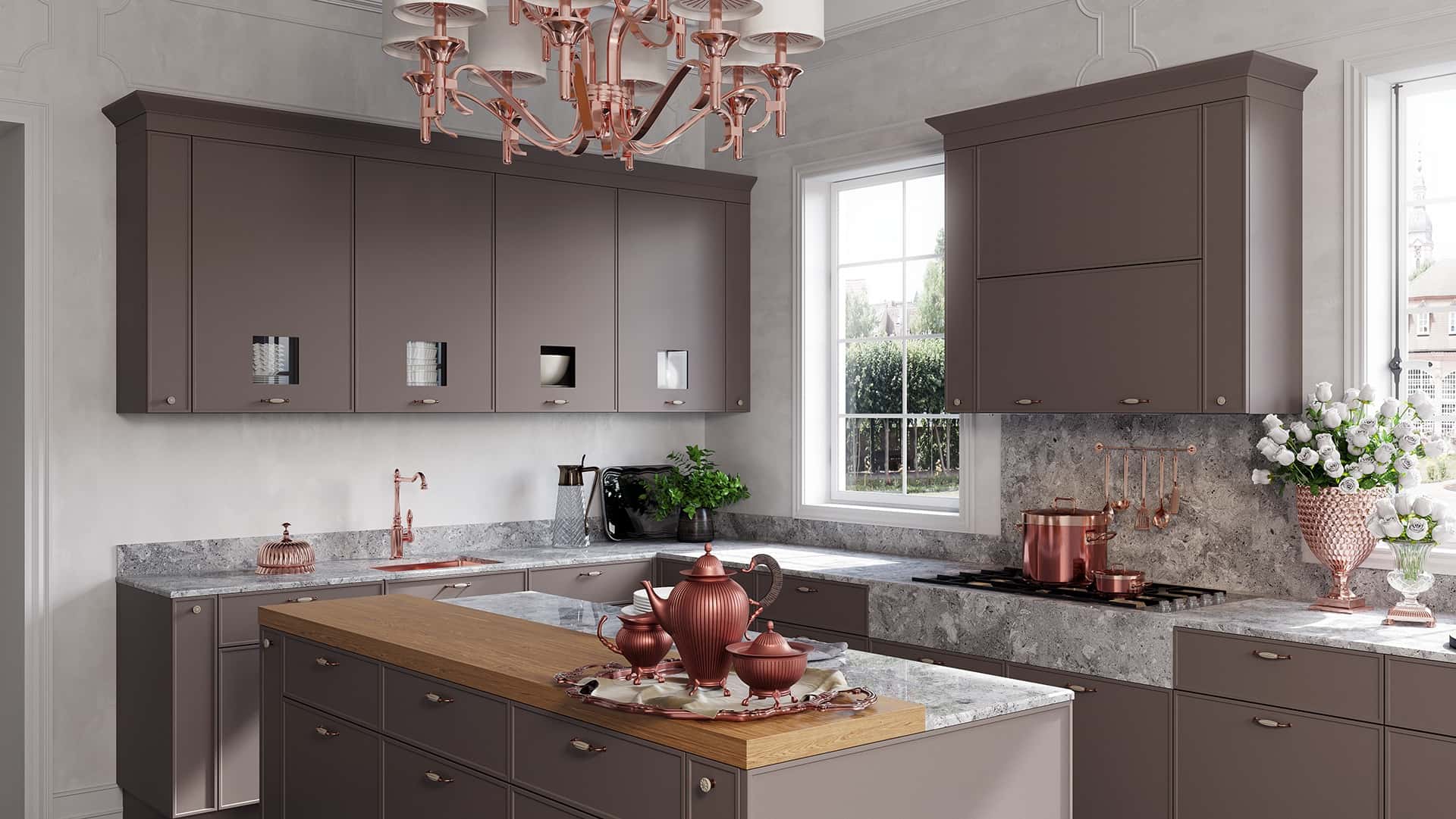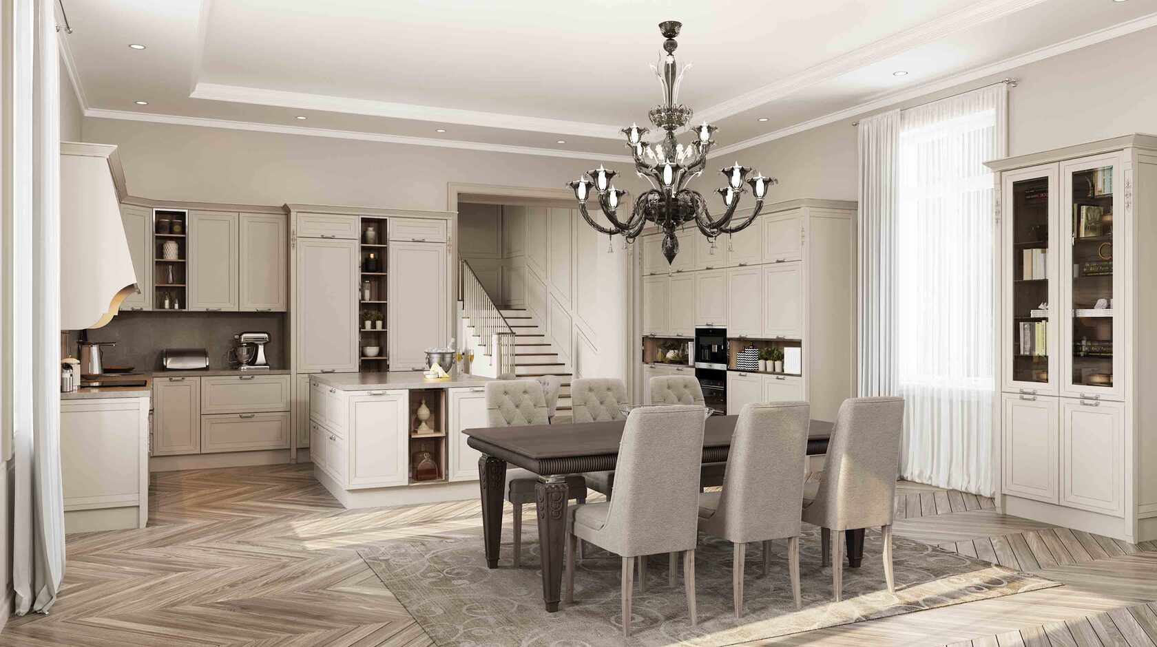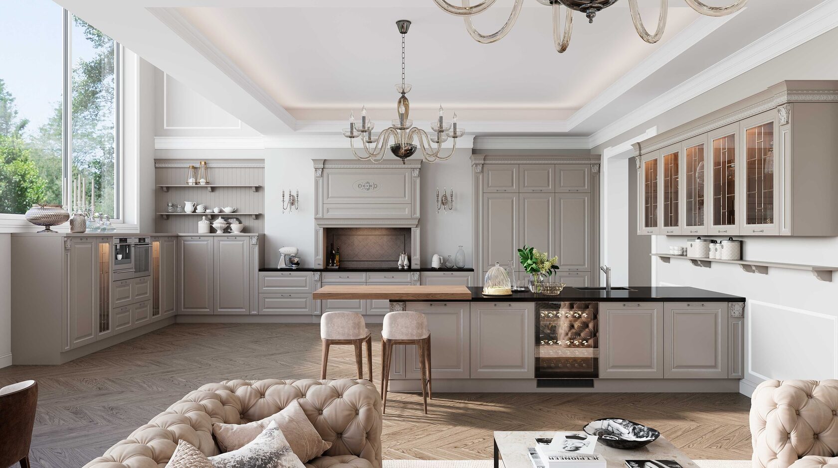 Претерпели изменения и витражи данной кухни. Гравировка стала более элегантной и легкой. А вновь разработанные карнизы с подкарнизником подчеркивают утонченного красоту итальянского дизайна. Добавив декор на подкарнизник, можно выделить часть кухонной конструкции. Обратите внимание, что корпуса за витринами выполнены из контрастного древесного декора.