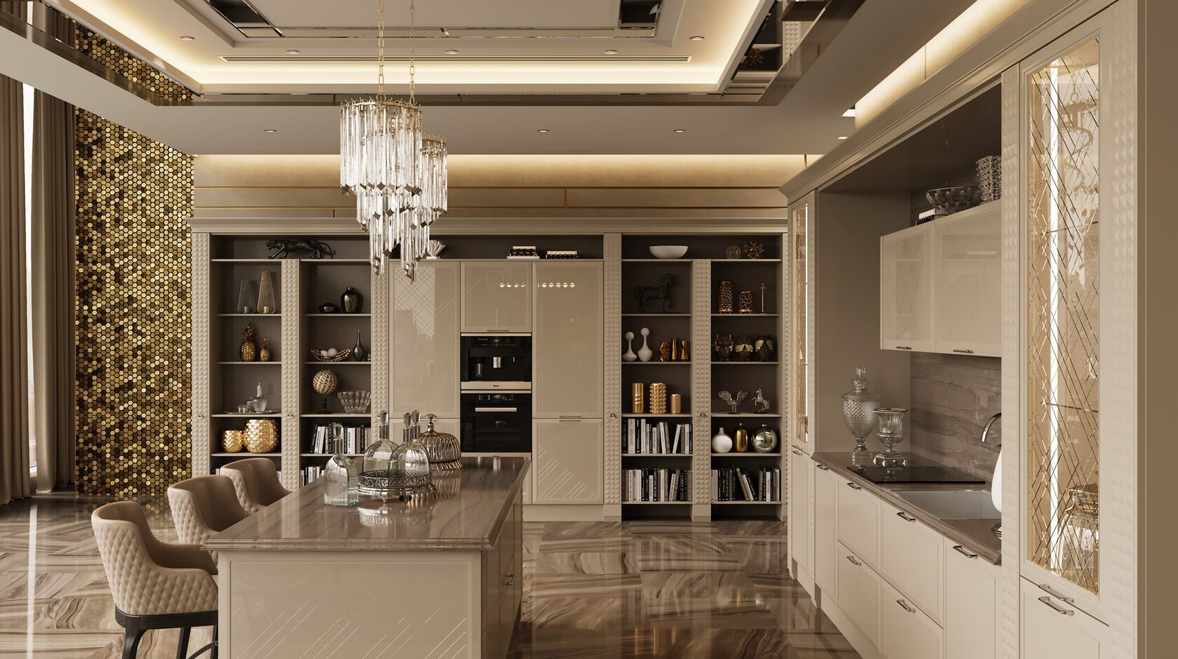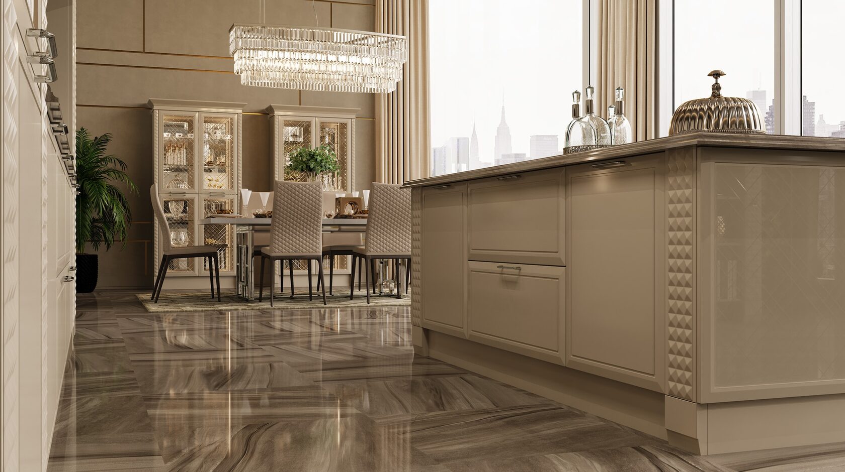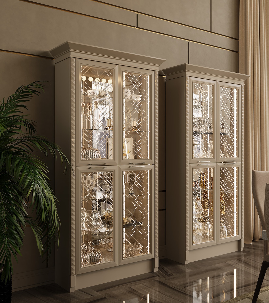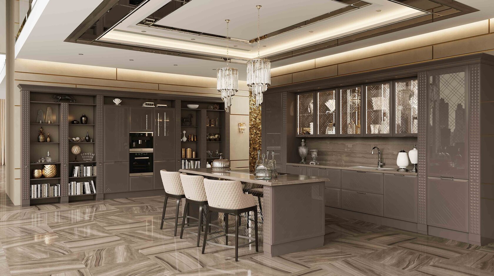 Отличительной чертой этой модели являются фасады, декорированные глянцевым стеклом с фрезеровкой Ланже. В качестве яркого акцента к основному тону кухни в интерьере преобладает использование золота или серебра.