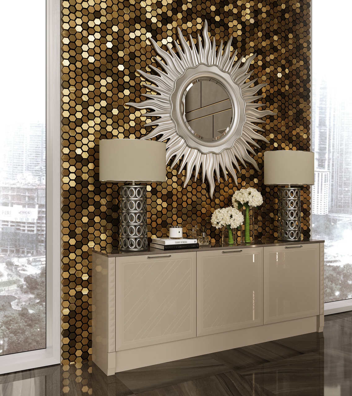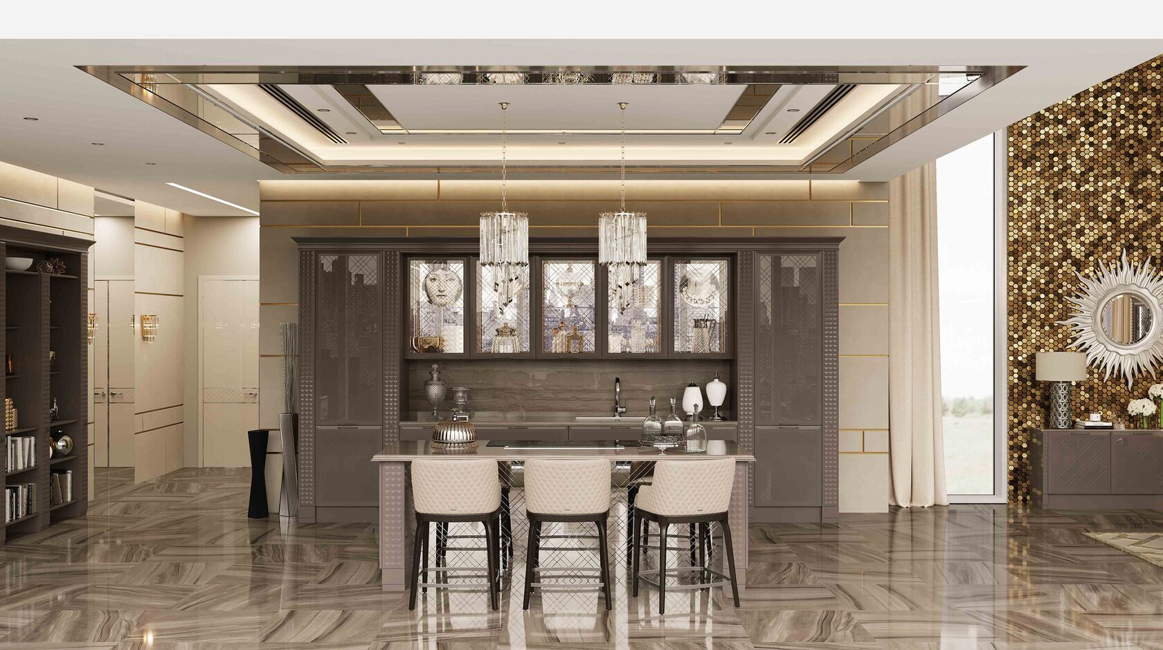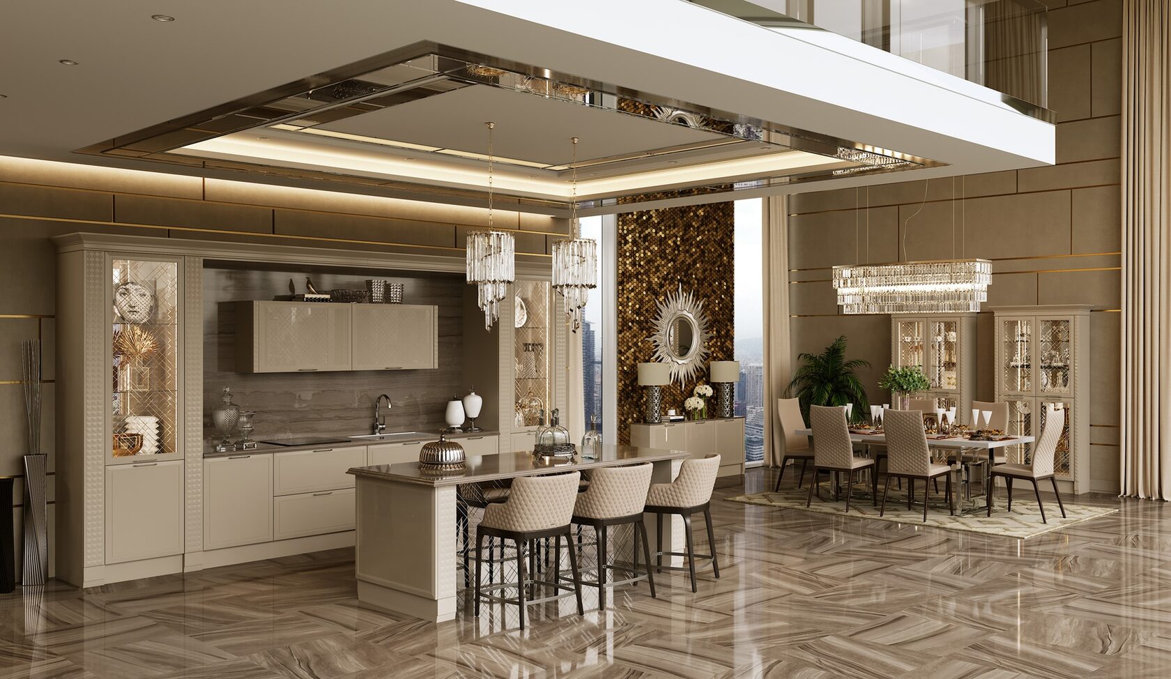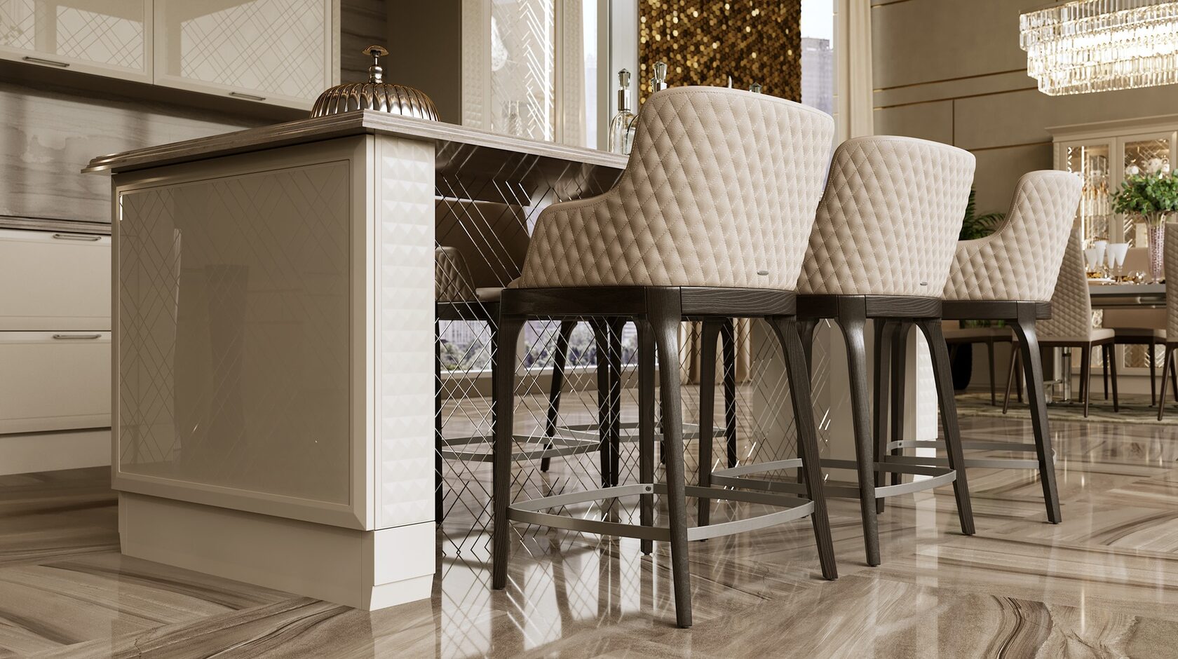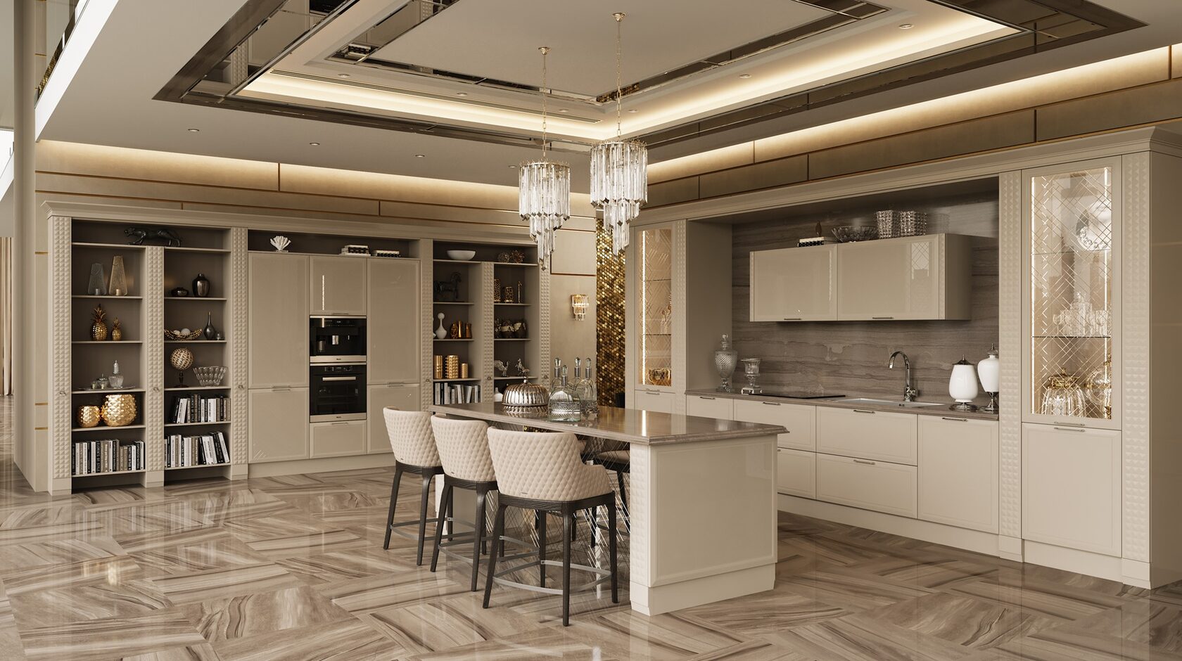 Отличительной чертой этой модели являются фасады, декорированные глянцевым стеклом с фрезеровкой Ланже. В качестве яркого акцента к основному тону кухни в интерьере преобладает использование золота или серебра.