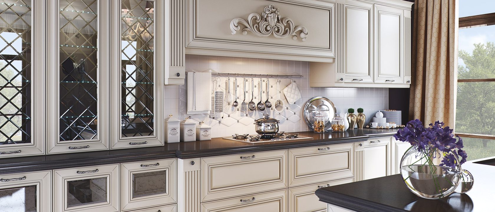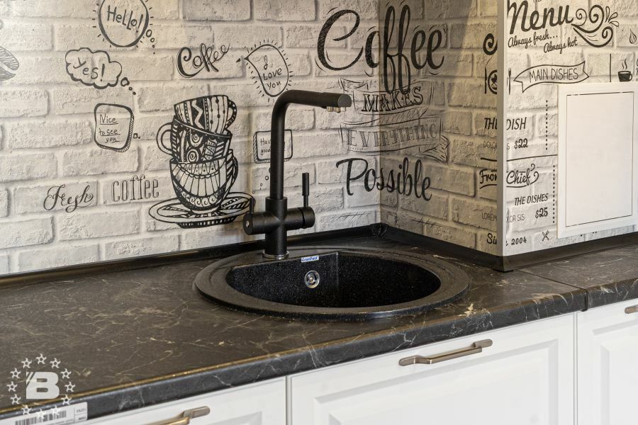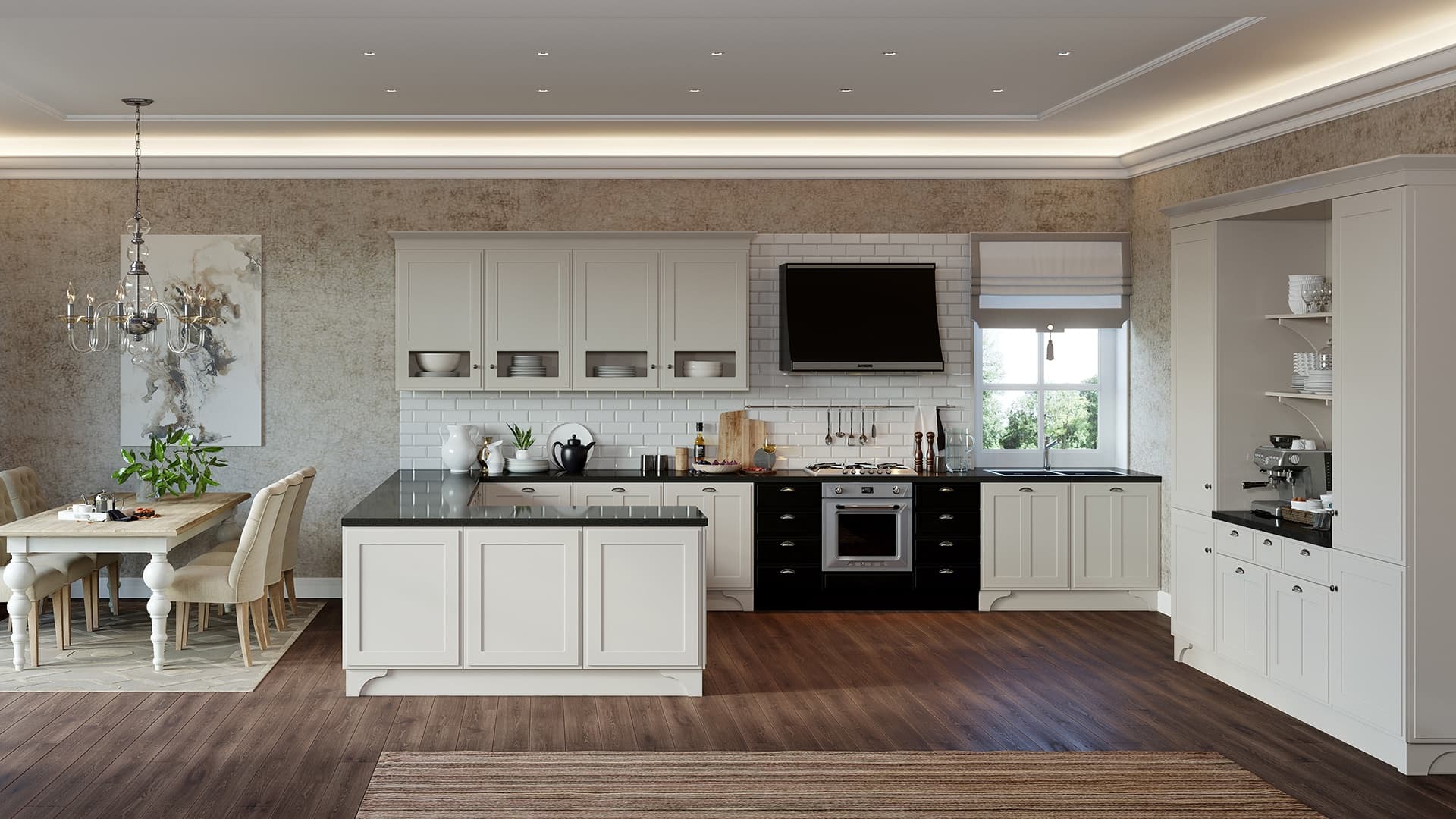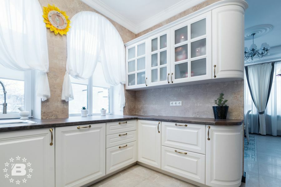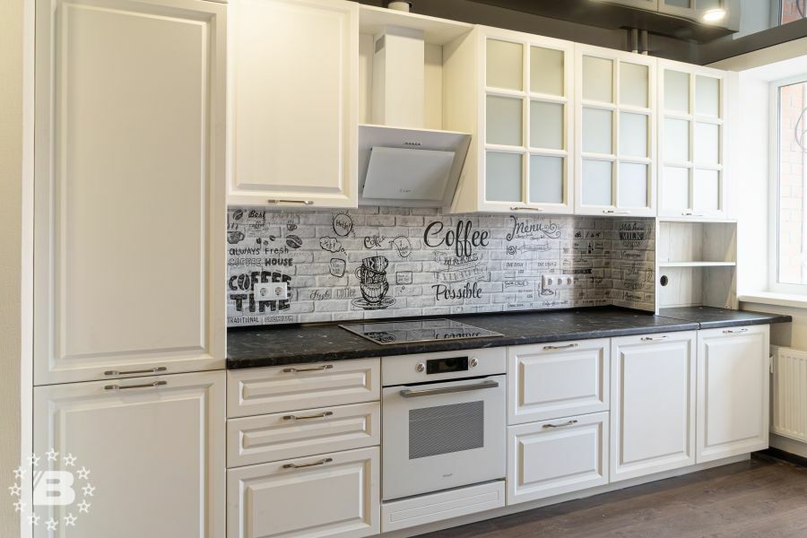 Большая белая кухня с темной столешницей. Роскошная белая кухня в классическом стиле соединила в себе элегантность, функциональность и практичность. Дизайн этой кухни вдохновляет, а внутреннее наполнение дарит максимальный комфорт. Особую индивидуальность придают кухне темная фактурная столешница и позитивный фартук кофейной тематики. За стеклянными фасадами разместится праздничная и повседневная посуда. Для бакалеи и кухонной утвари предусмотрено множество вместительных ящиков и выкатных систем.