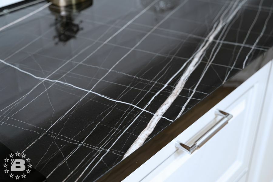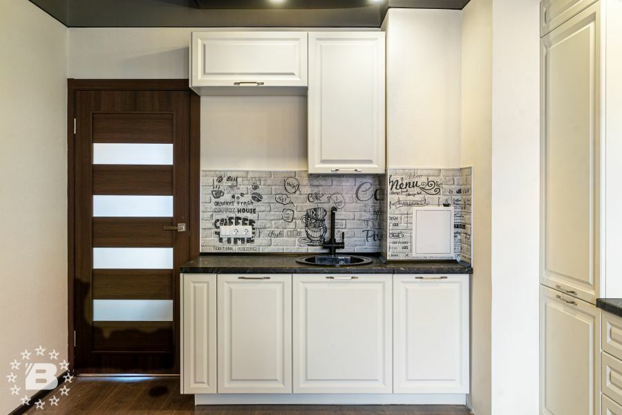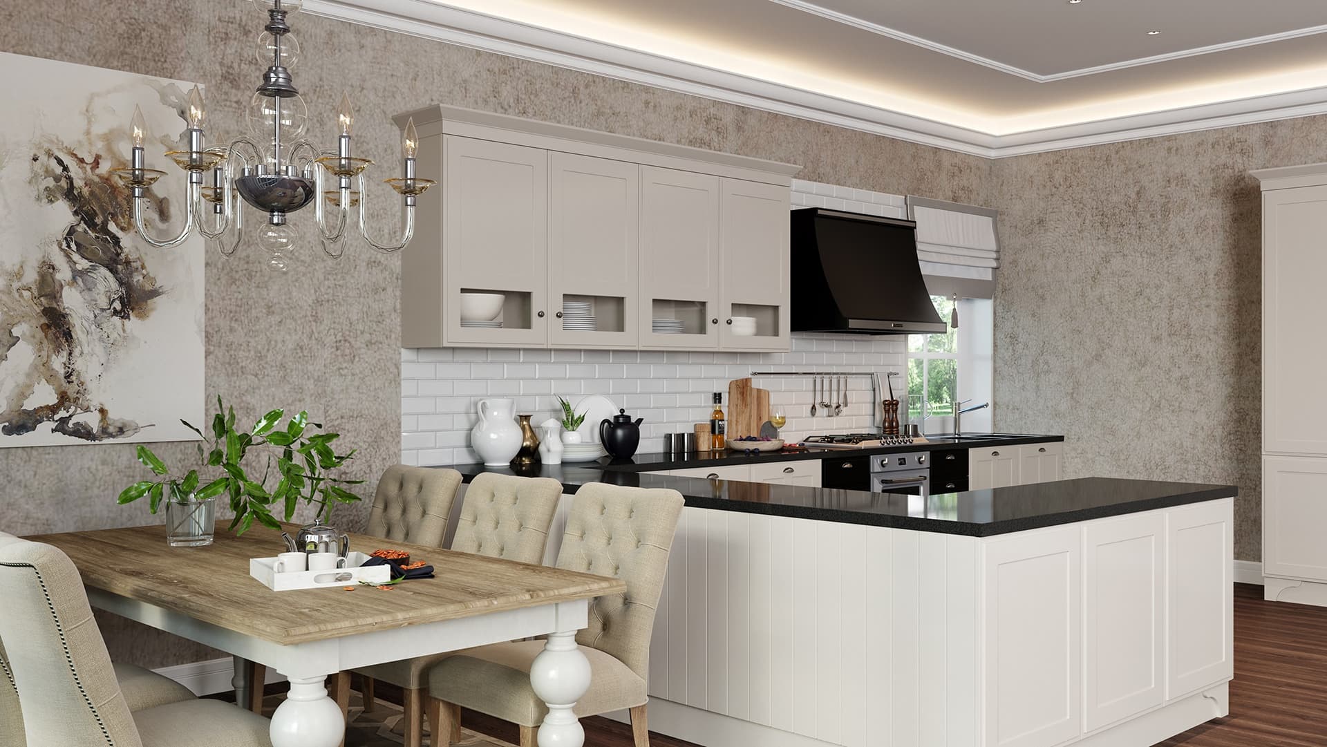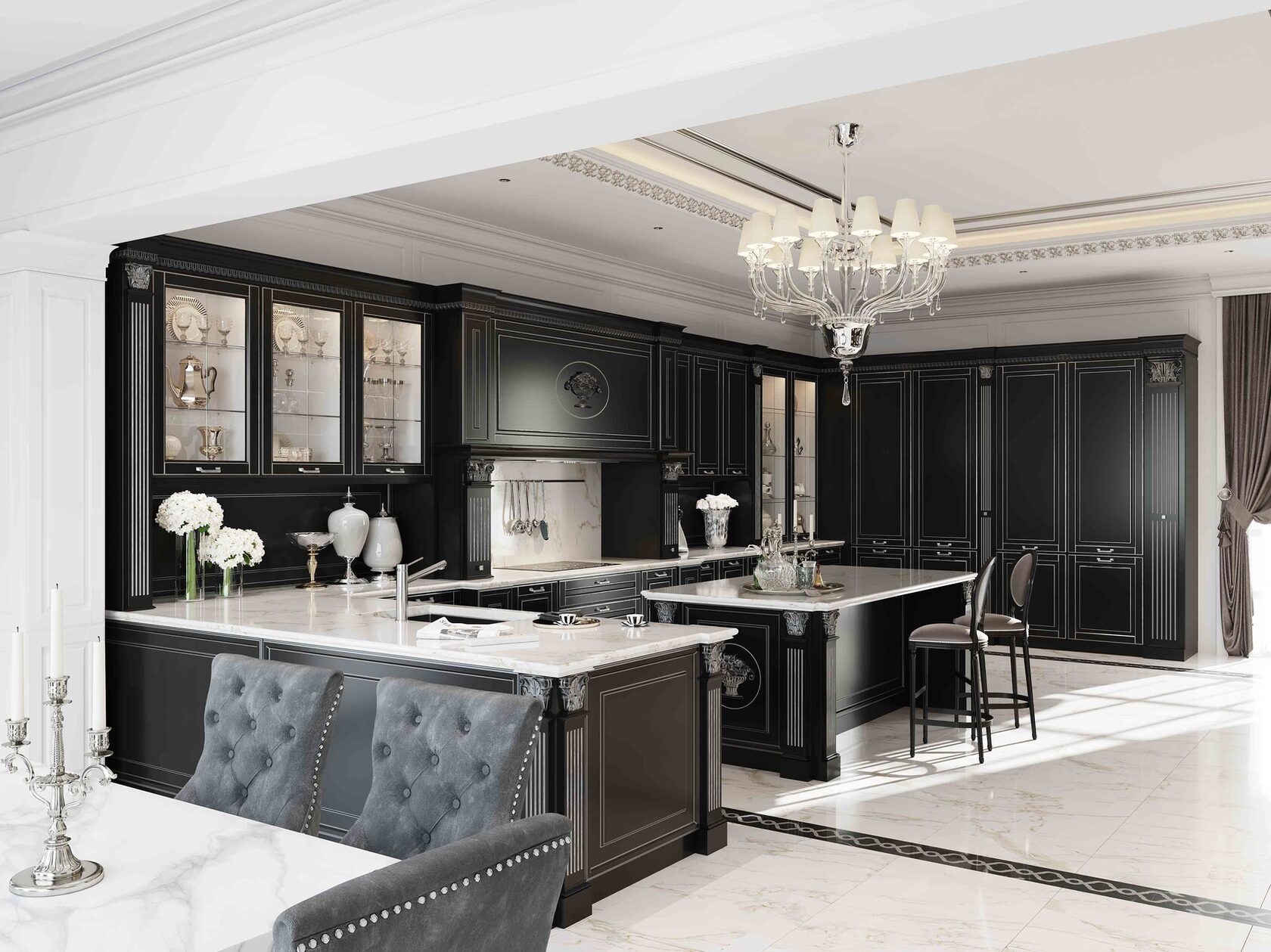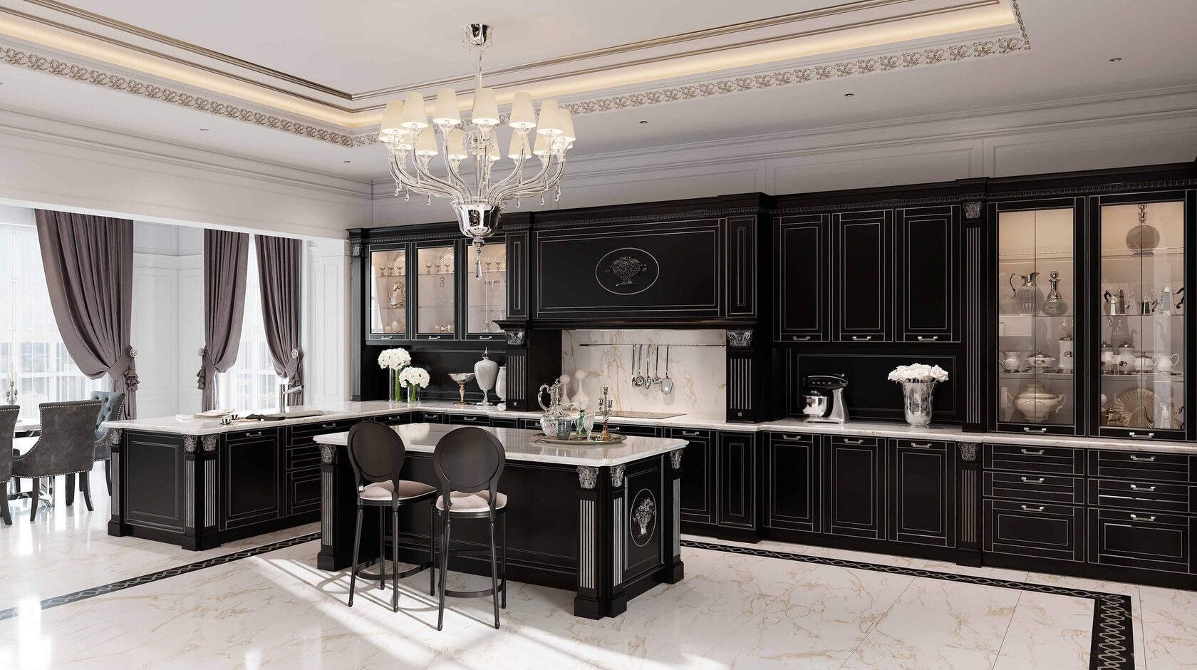 Большая белая кухня с темной столешницей. Роскошная белая кухня в классическом стиле соединила в себе элегантность, функциональность и практичность. Дизайн этой кухни вдохновляет, а внутреннее наполнение дарит максимальный комфорт. Особую индивидуальность придают кухне темная фактурная столешница и позитивный фартук кофейной тематики. За стеклянными фасадами разместится праздничная и повседневная посуда. Для бакалеи и кухонной утвари предусмотрено множество вместительных ящиков и выкатных систем.