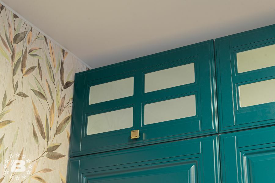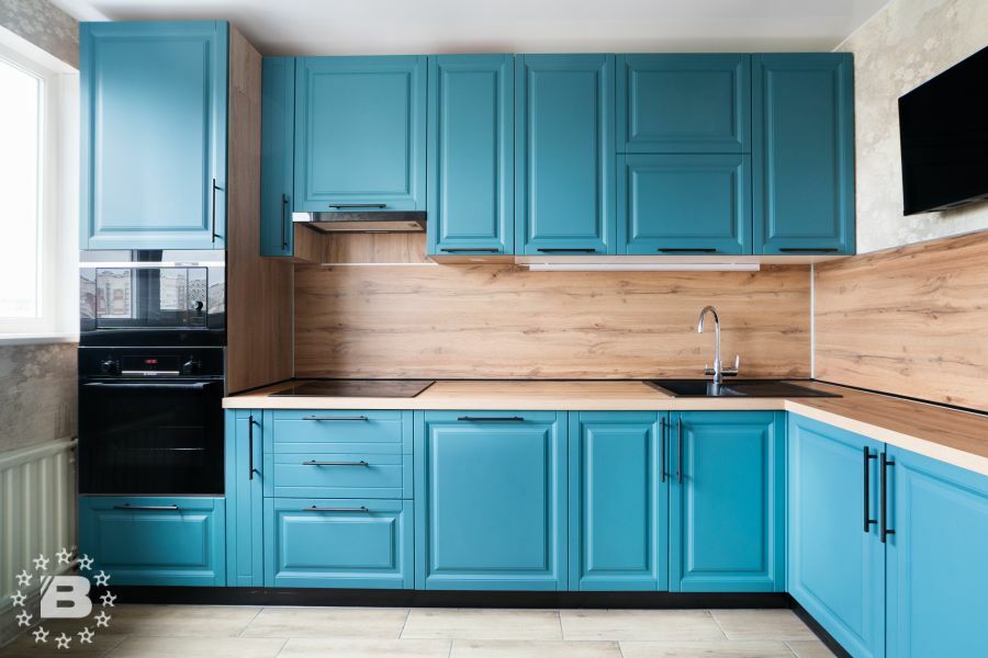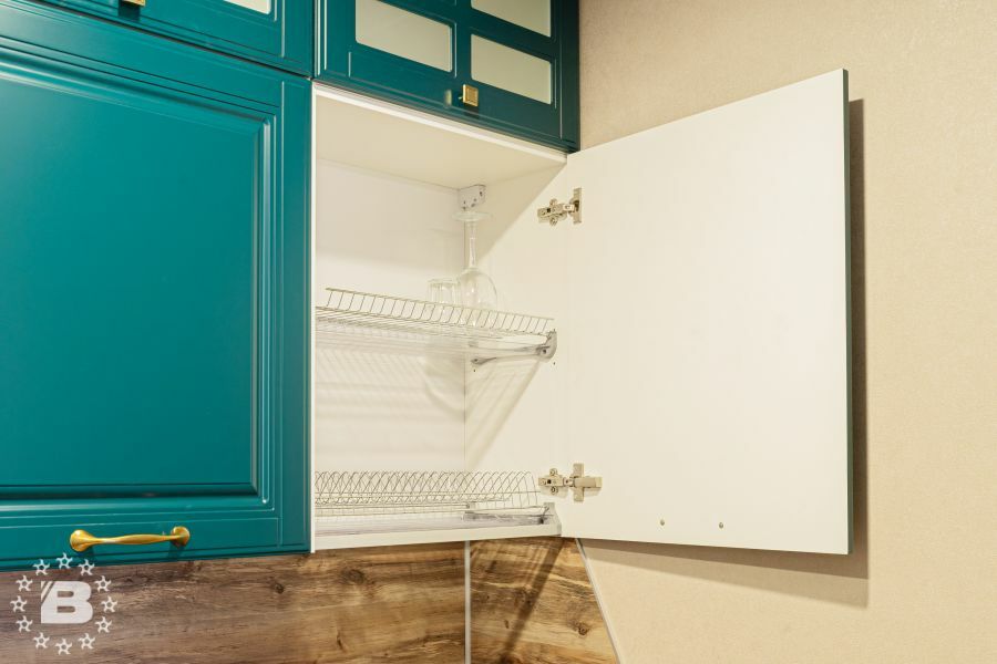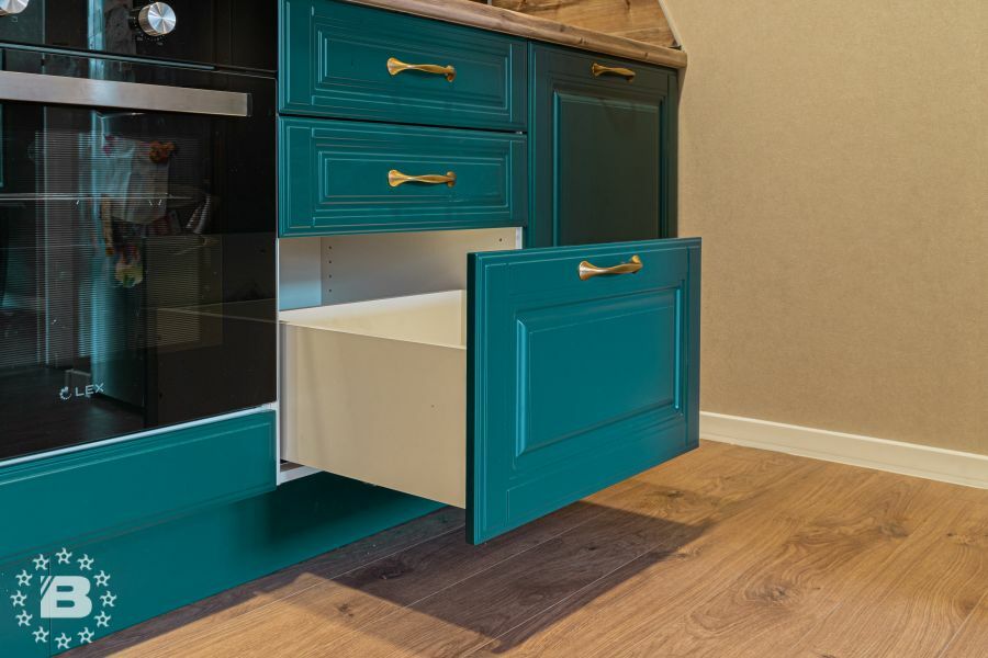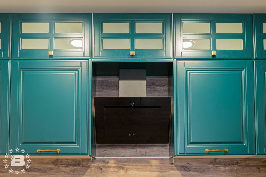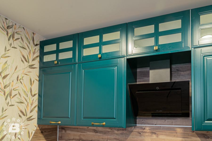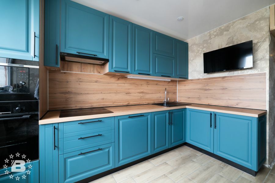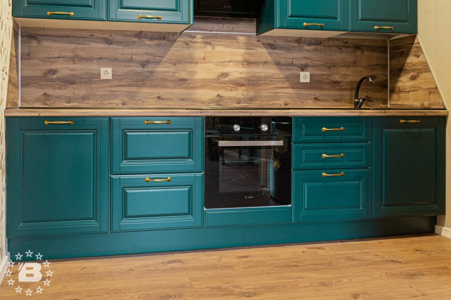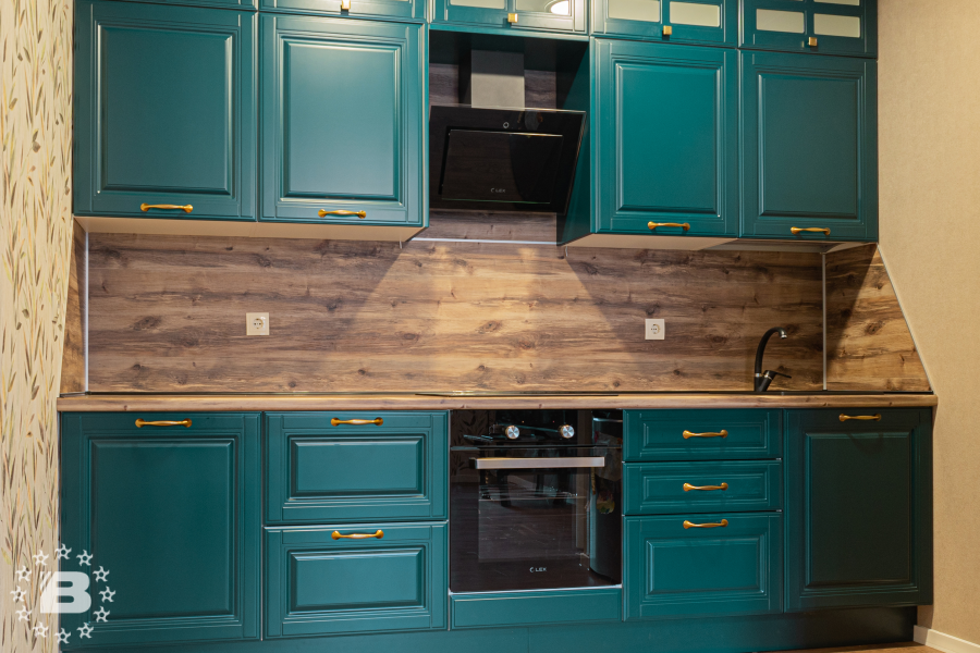 Матовая сине-зеленая классическая кухня украсит квартиру. Бронзовые ручки и элегантные фасады подчеркивают аристократичный дизайн. А деревянные столешница и фартук дополняют гарнитур теплом и уютом.