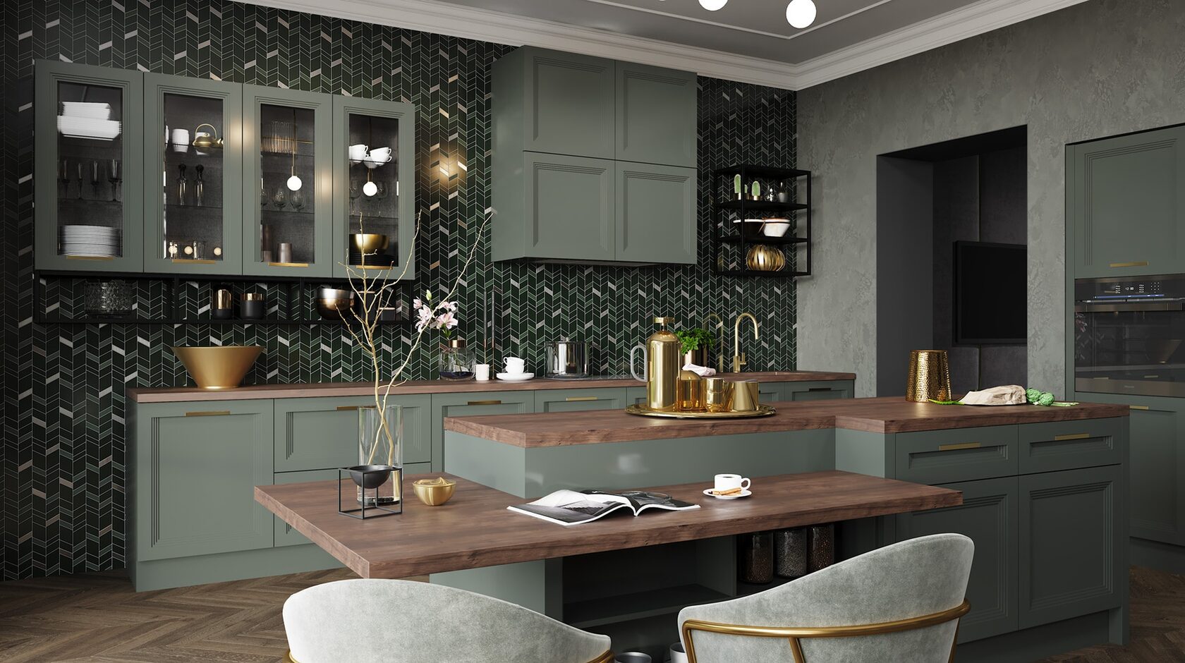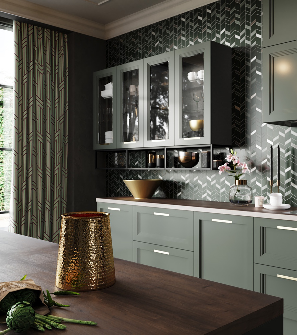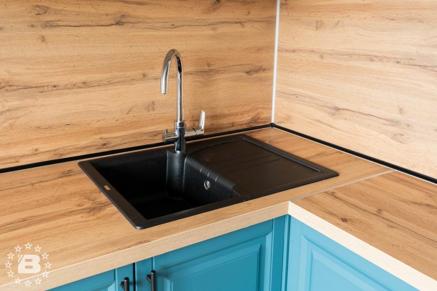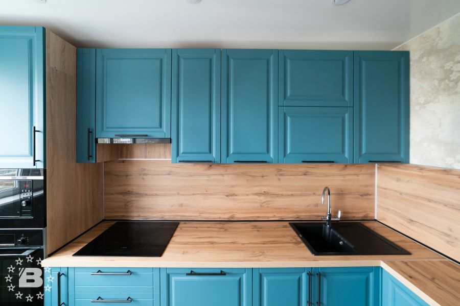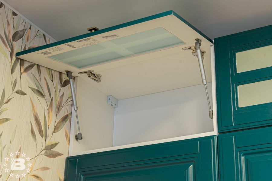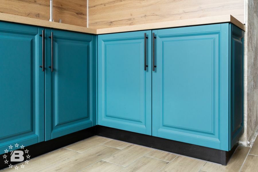 Матовая сине-зеленая классическая кухня украсит квартиру. Бронзовые ручки и элегантные фасады подчеркивают аристократичный дизайн. А деревянные столешница и фартук дополняют гарнитур теплом и уютом.