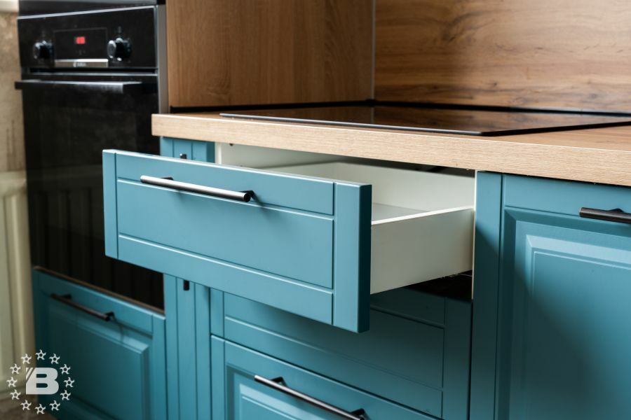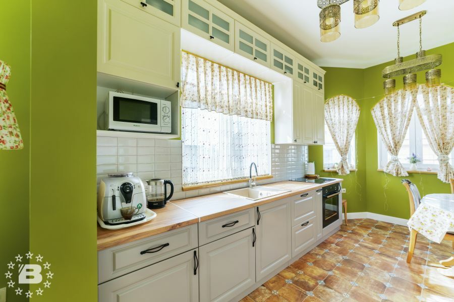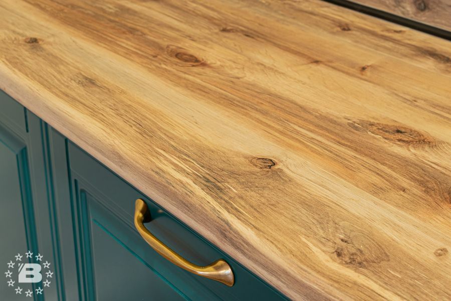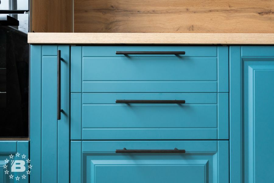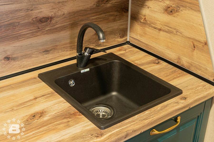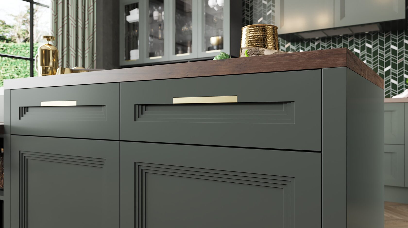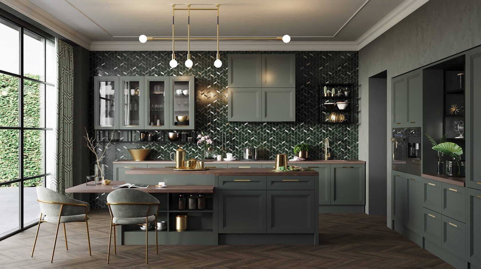 Матовая сине-зеленая классическая кухня украсит квартиру. Бронзовые ручки и элегантные фасады подчеркивают аристократичный дизайн. А деревянные столешница и фартук дополняют гарнитур теплом и уютом.
