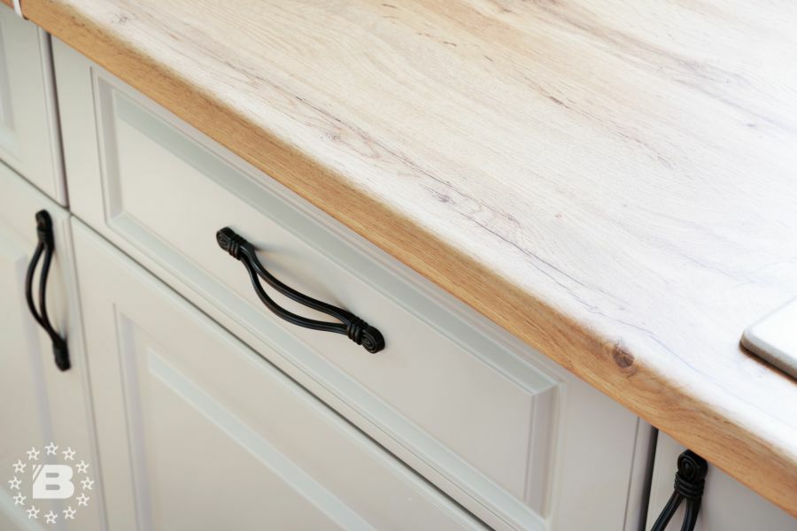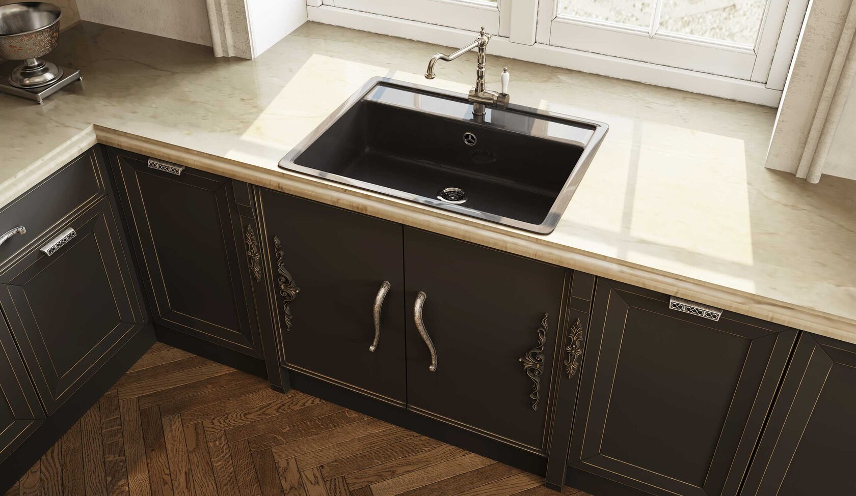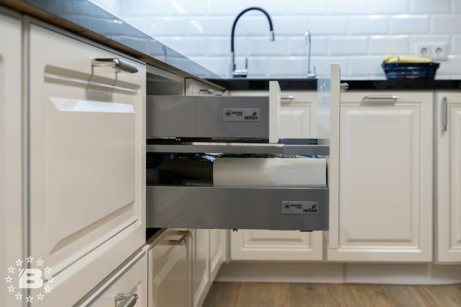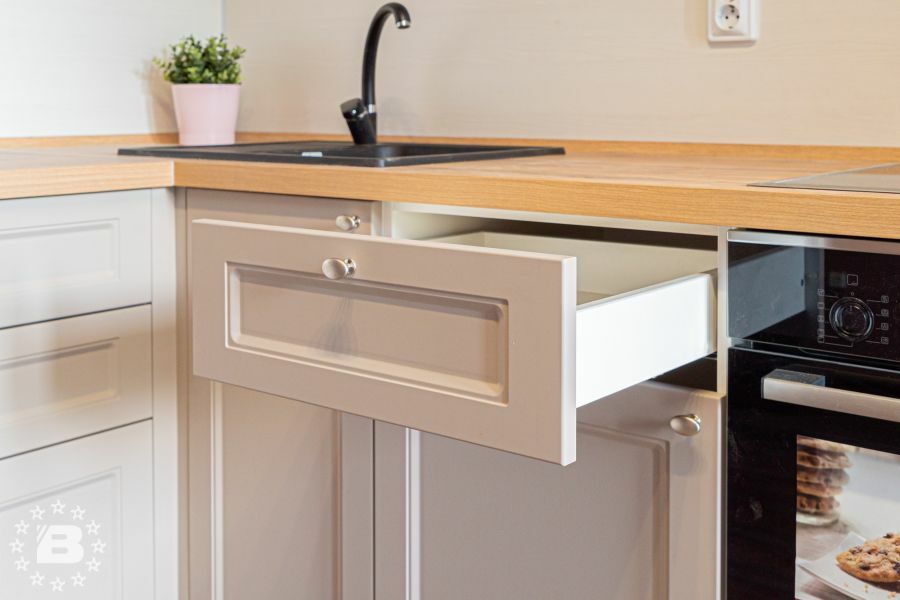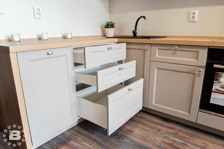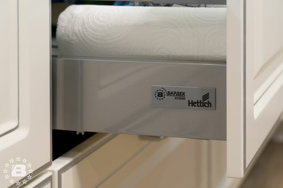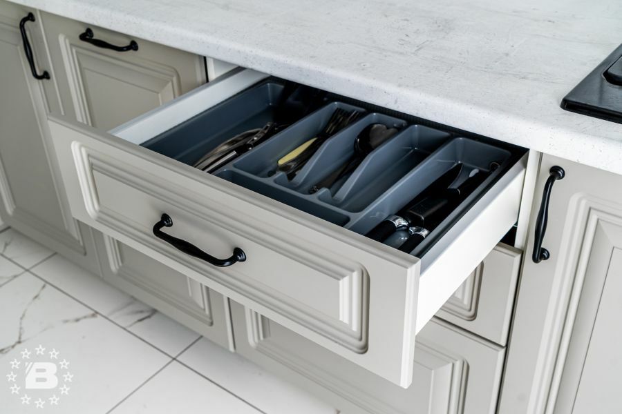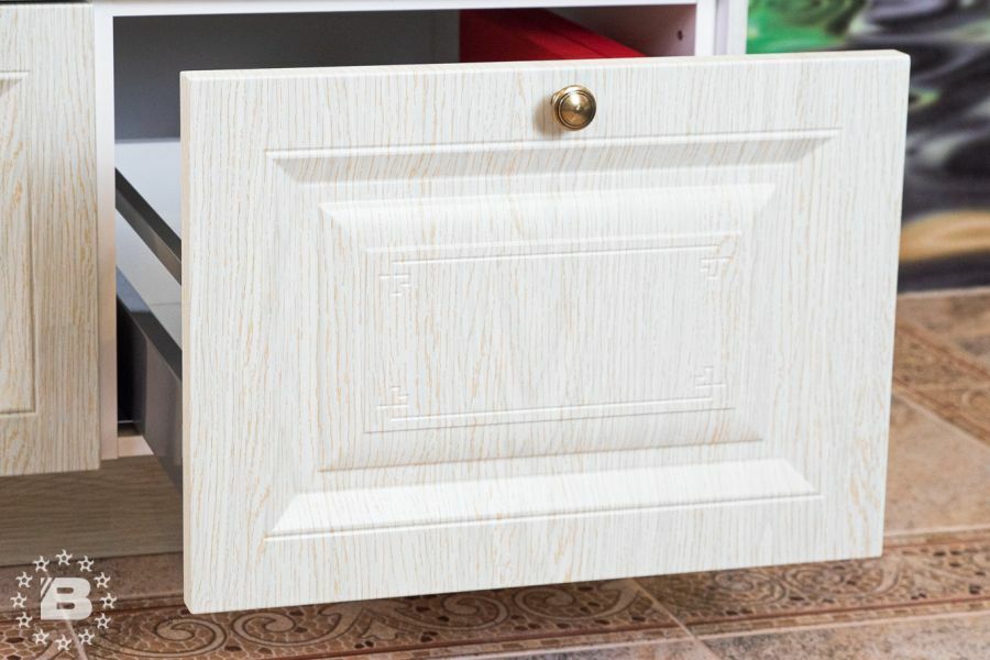 Фасады гарнитура выполнены из высококачественного МДФ толщиной 22 мм в окрашенном варианте или с декоративным покрытием из ПВХ. Лицевые поверхности могут быть декорированы всеми видами патины РИМИ.