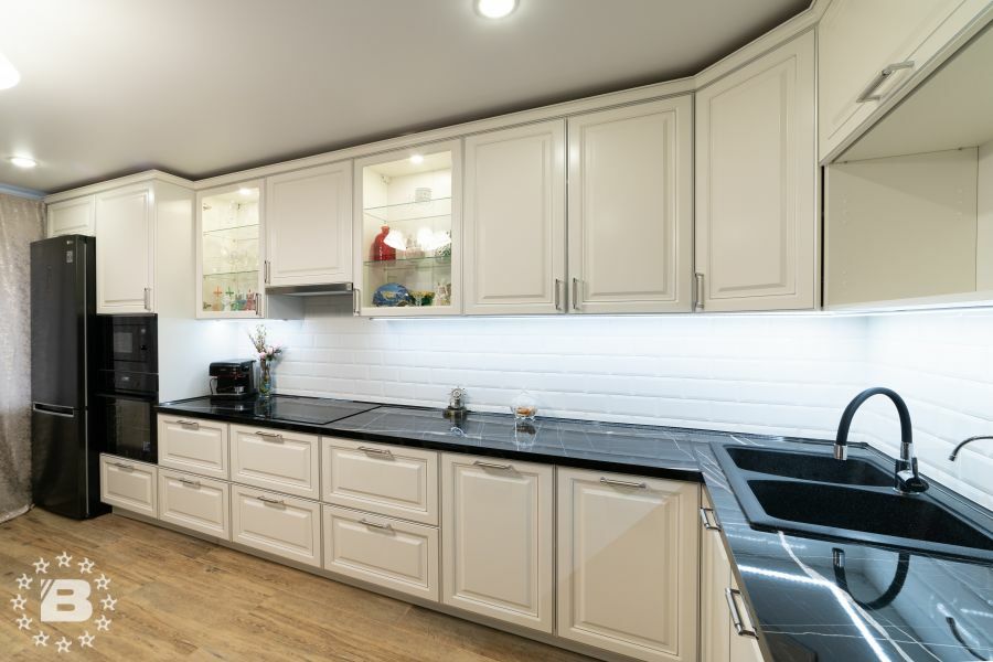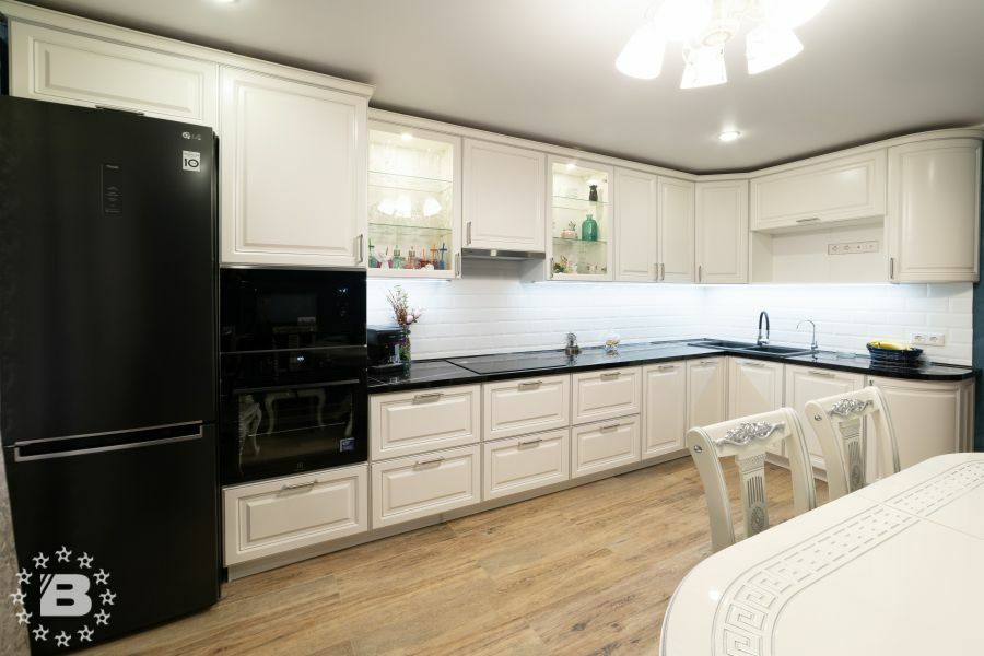 Элегантная белая кухня Надежда. Кухонный гарнитур, выполненный в неоклассическом стиле. Очень стильно смотрятся черная столешница гнутые фасады. В шкафах-витринах разместится красивая посуда.