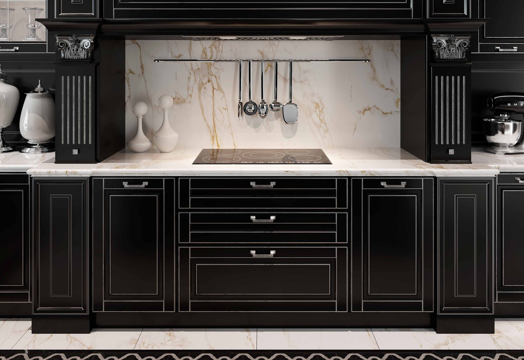Отличительной чертой этой модели является уникальная по дизайну вытяжка, повторяющая по форме капот легендарной модели Ferrari. Мастерски исполненный сложный фасад, с тщательно выверенными пропорциями, придает этой модели особенную торжественность и изысканность. Терминальные пилястры с ярко выраженным утонченным декором подчеркивает неповторимый итальянский стиль.