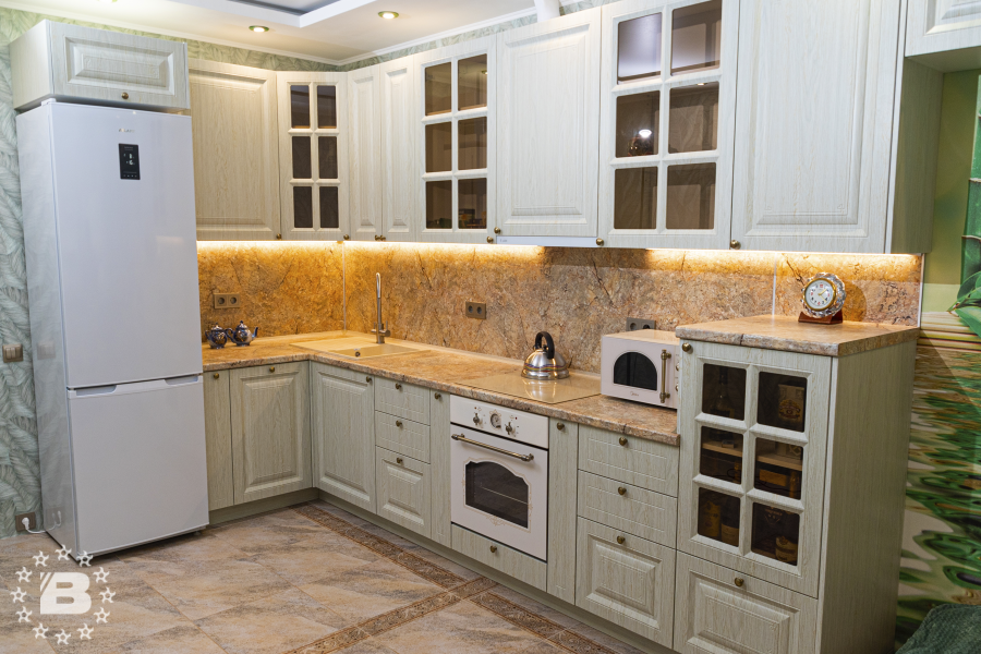 Кухня "Мокко" в бежевых тонах элегантное решение для вашего дома. Бежевые кухни выбирают любители классических интерьеров. Гарнитур выполнен до потолка, что позволяет организовать дополнительные места хранения, которые никогда не бывают лишними. Бежевый цвет является универсальным и практичным, он может стать отправной точкой для оформления всего интерьера. МДФ фасады с фрезеровкой и золотистые ручки придают гарнитуру особую утонченность. При производстве фасадов используется специальная пленка. Фасады в такой пленке влагостойкие, устойчивы к выгоранию и температуре. Уход за такими фасадами очень простой.