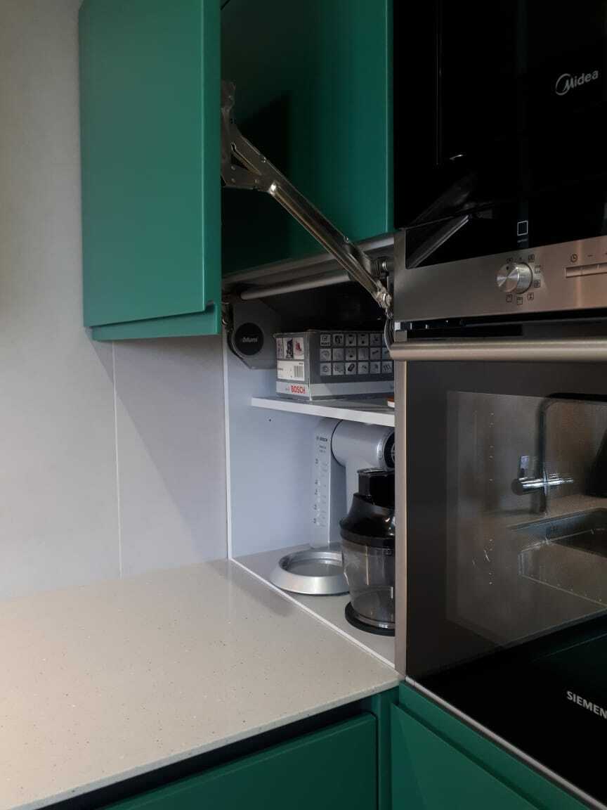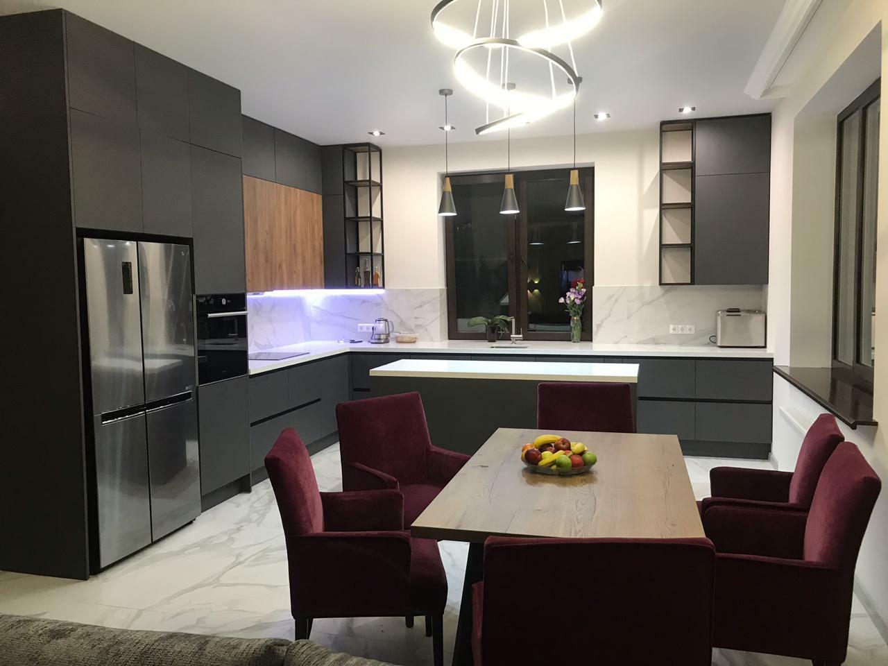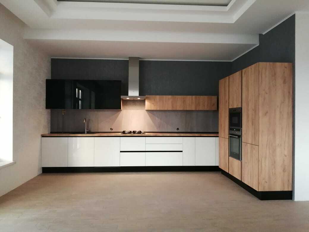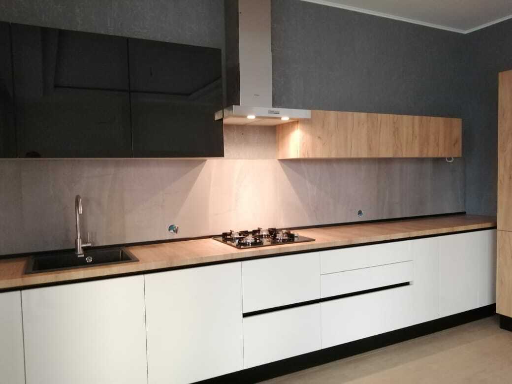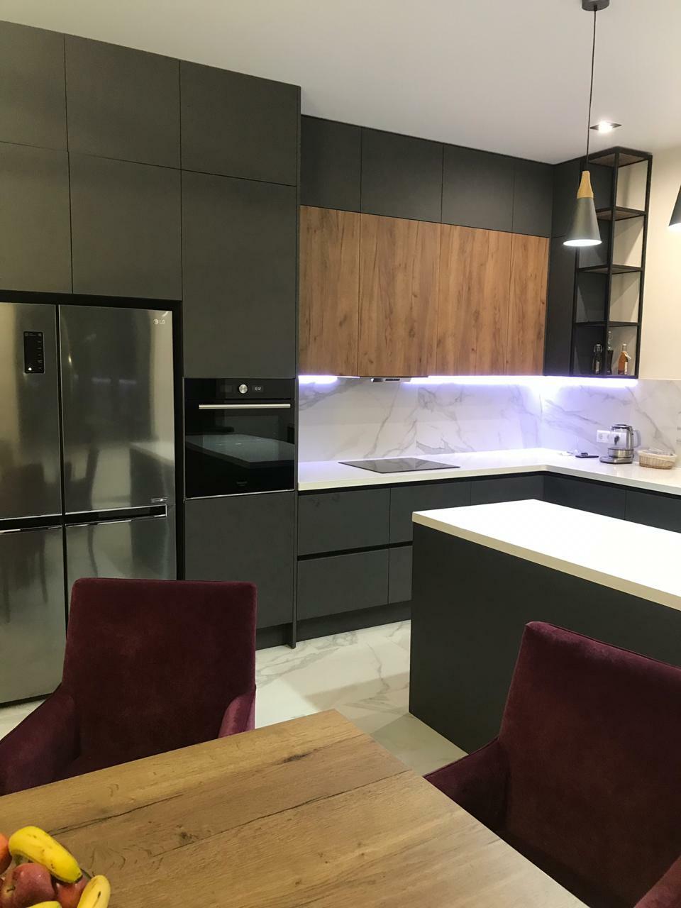 Ручка и фасад являются единым целым, что обеспечивает функциональность интерьера, позволяет оптимально использовать пространство и избавляет от затрат на подбор и установку мебельных ручек. Новейшие технологии, использованные при производстве этой кухни, делают ее долговечной и универсальной.